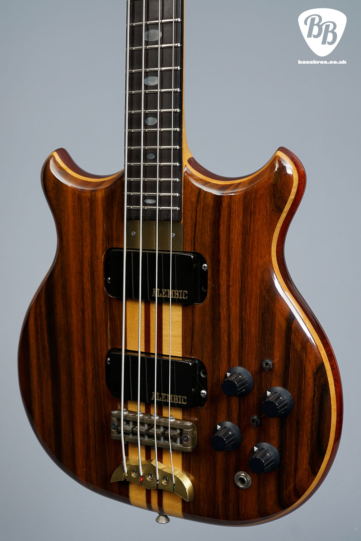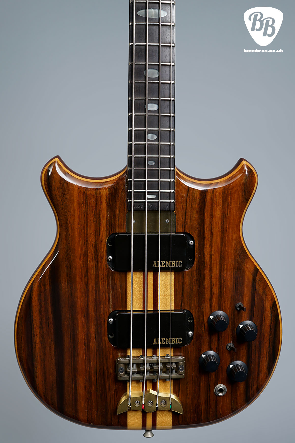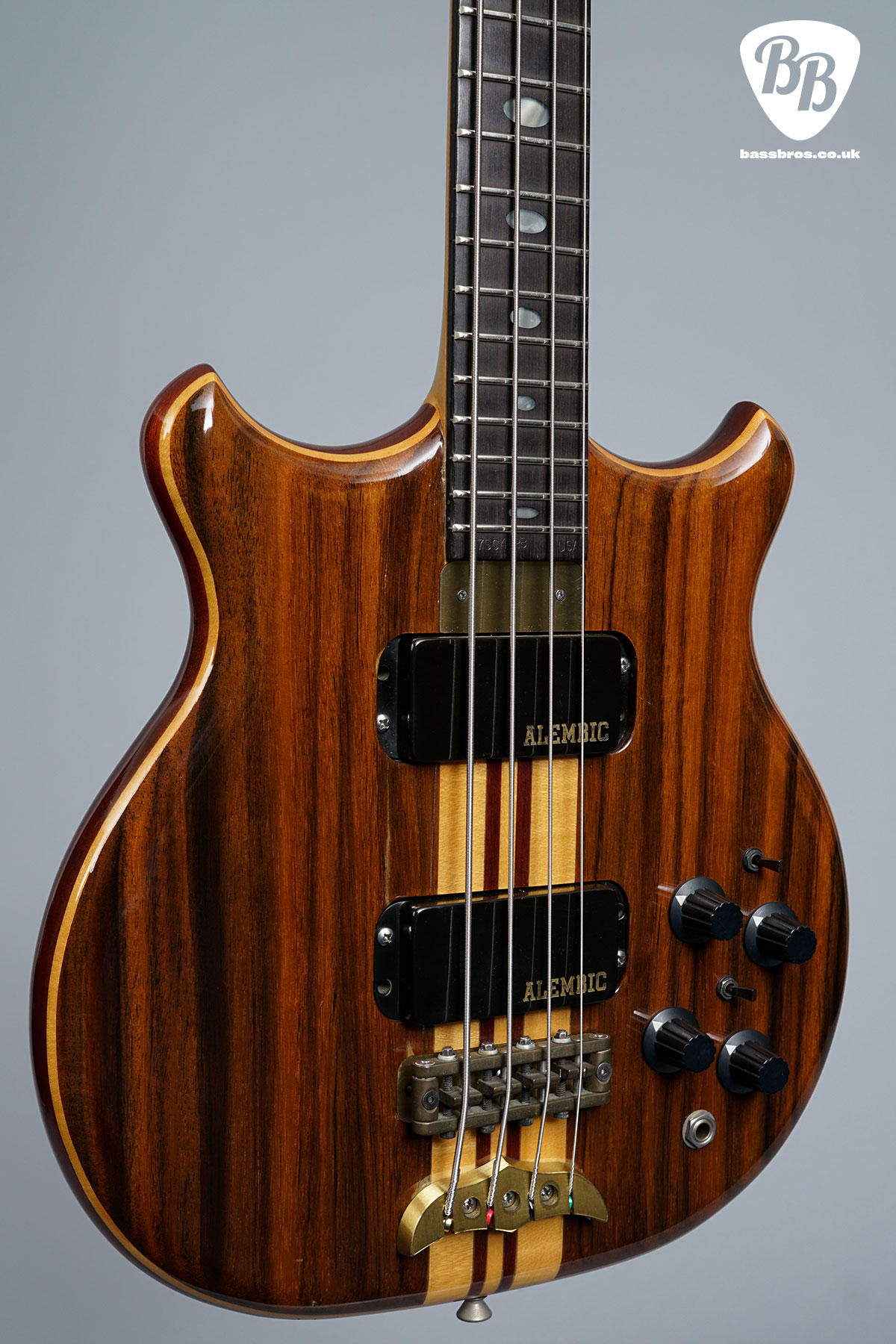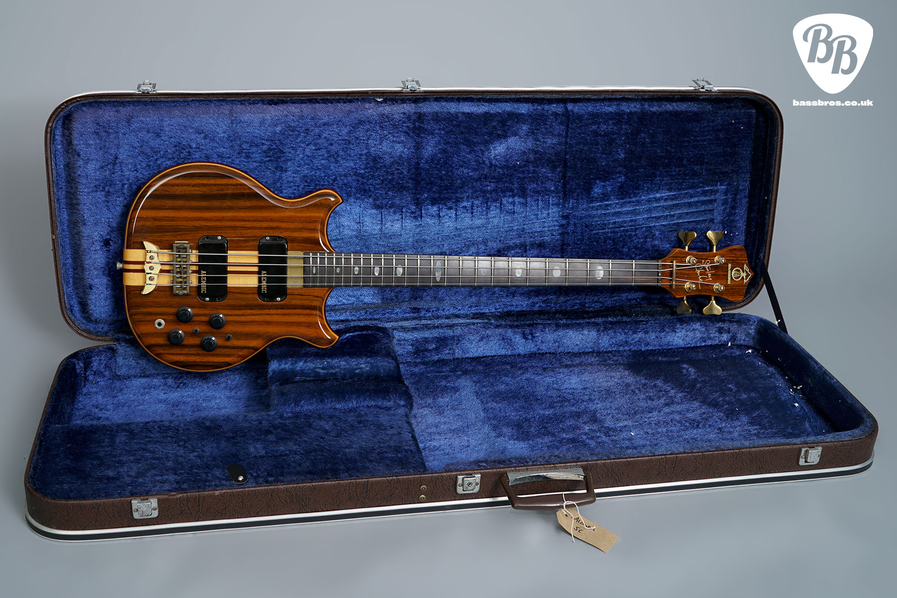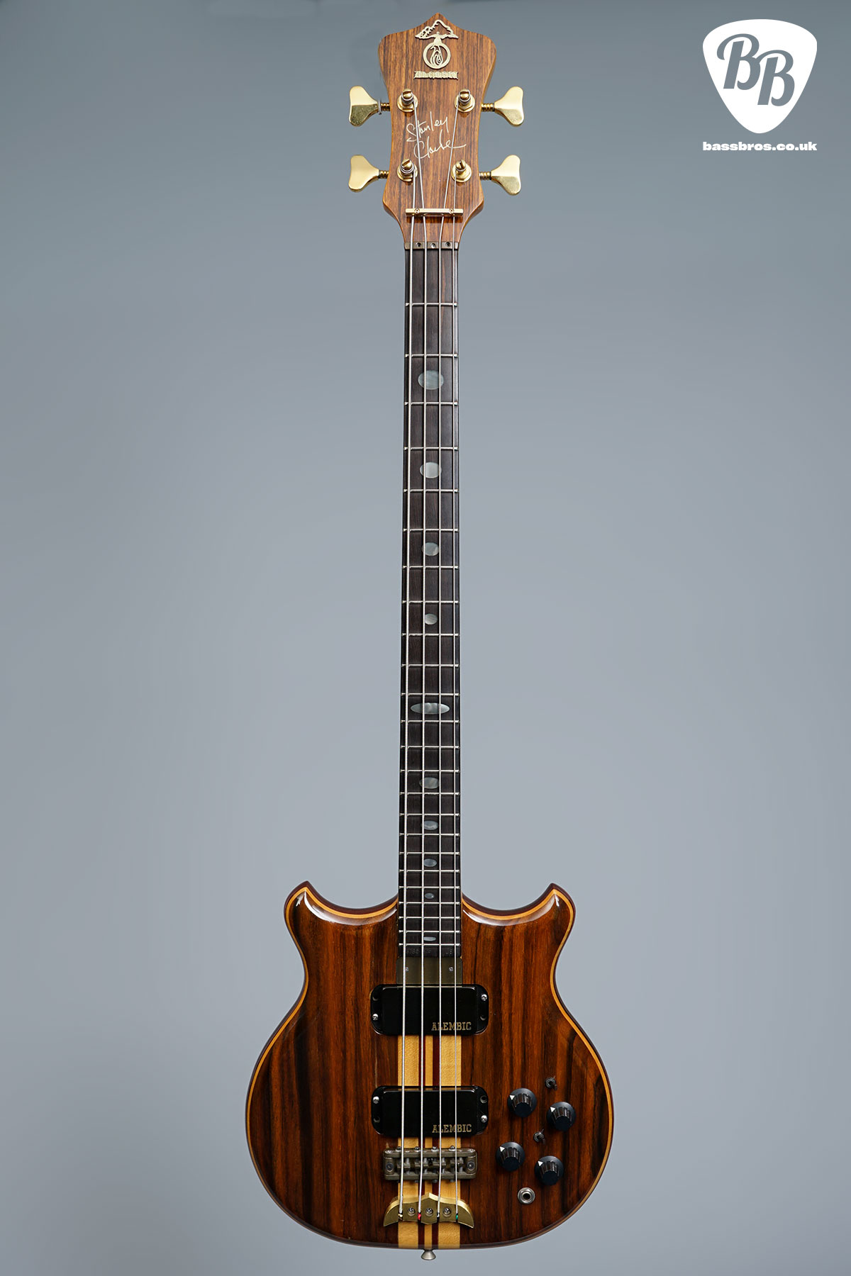 Here we have another fabulous Alembic Stanley Clarke with rosewood front and back facings. These Alembic basses are highly regarded for their exceptional build quality and playability (especially being 30.75″ scale). This one is in very good condition with some small marks to the finish throughout, and some very small marks to the brass backplate. There has also been a string tree added on the headstock. We have given the bass a full check over and everything works perfectly as it should, including the truss rod and electronics. Included is a non-original hardcase.