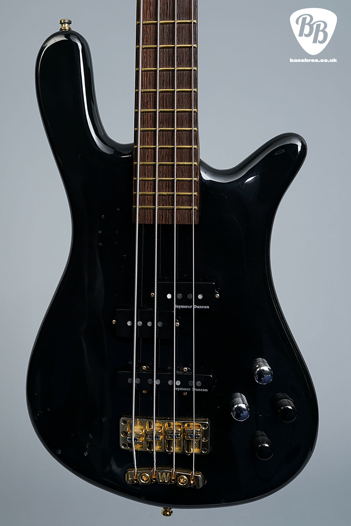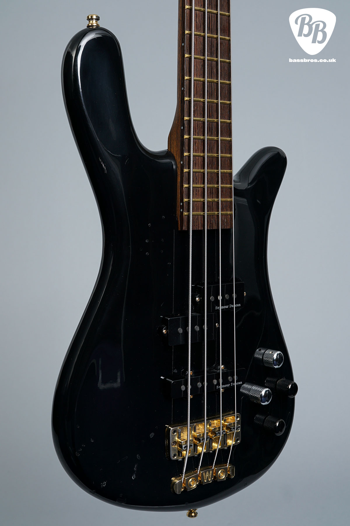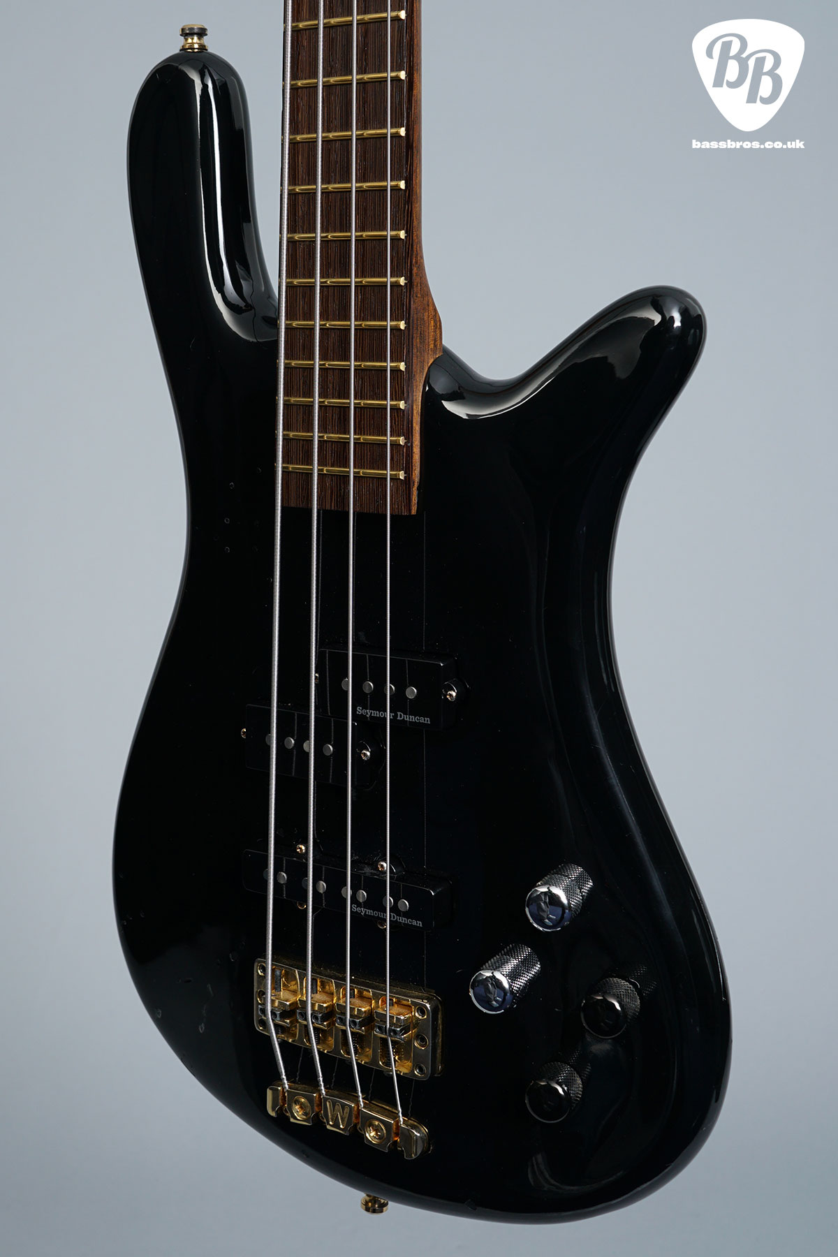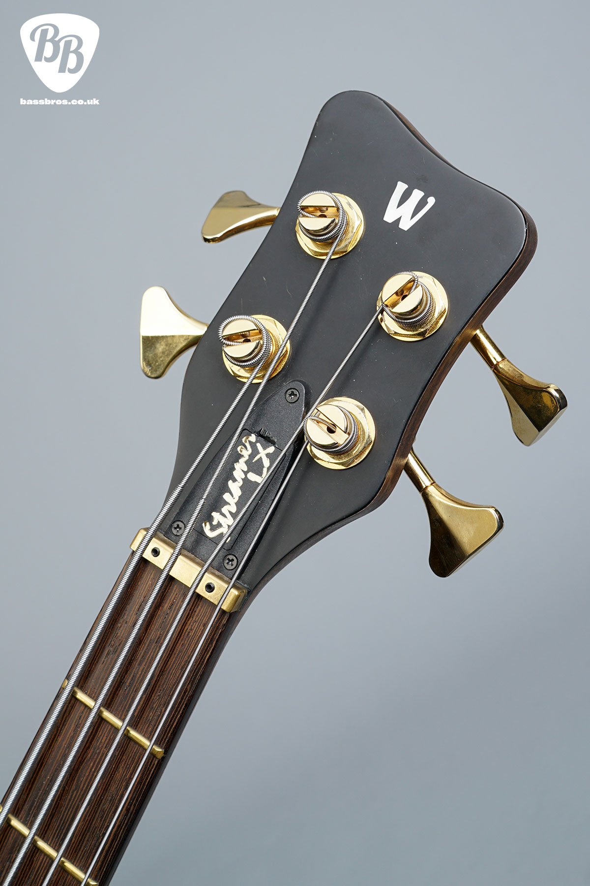 Here is a German made Warwick LX4 in black gloss finish. There are a lot of marks to the body throughout, as well as dings to the front, and a lot of scratching to the finish on the back. The pickups have been replaced with a set of Seymour Duncan pickups and the preamp has been changed to a Glokenklang preamp. The control knobs have also been changed. We have fully tested the electronics and trussrod and everything works perfectly.