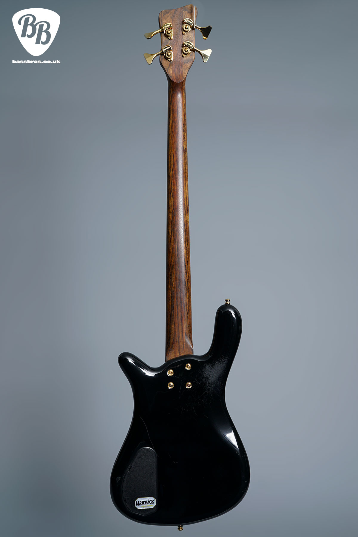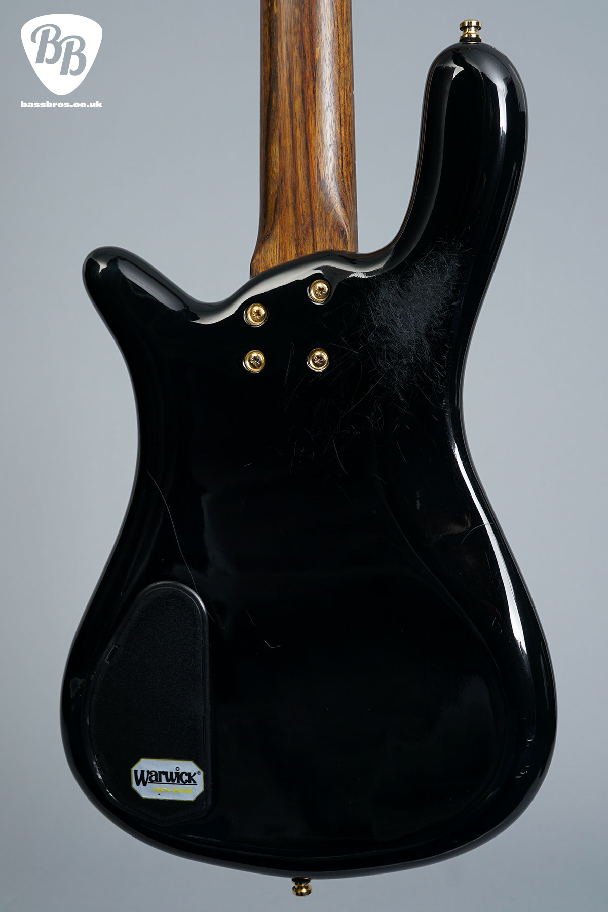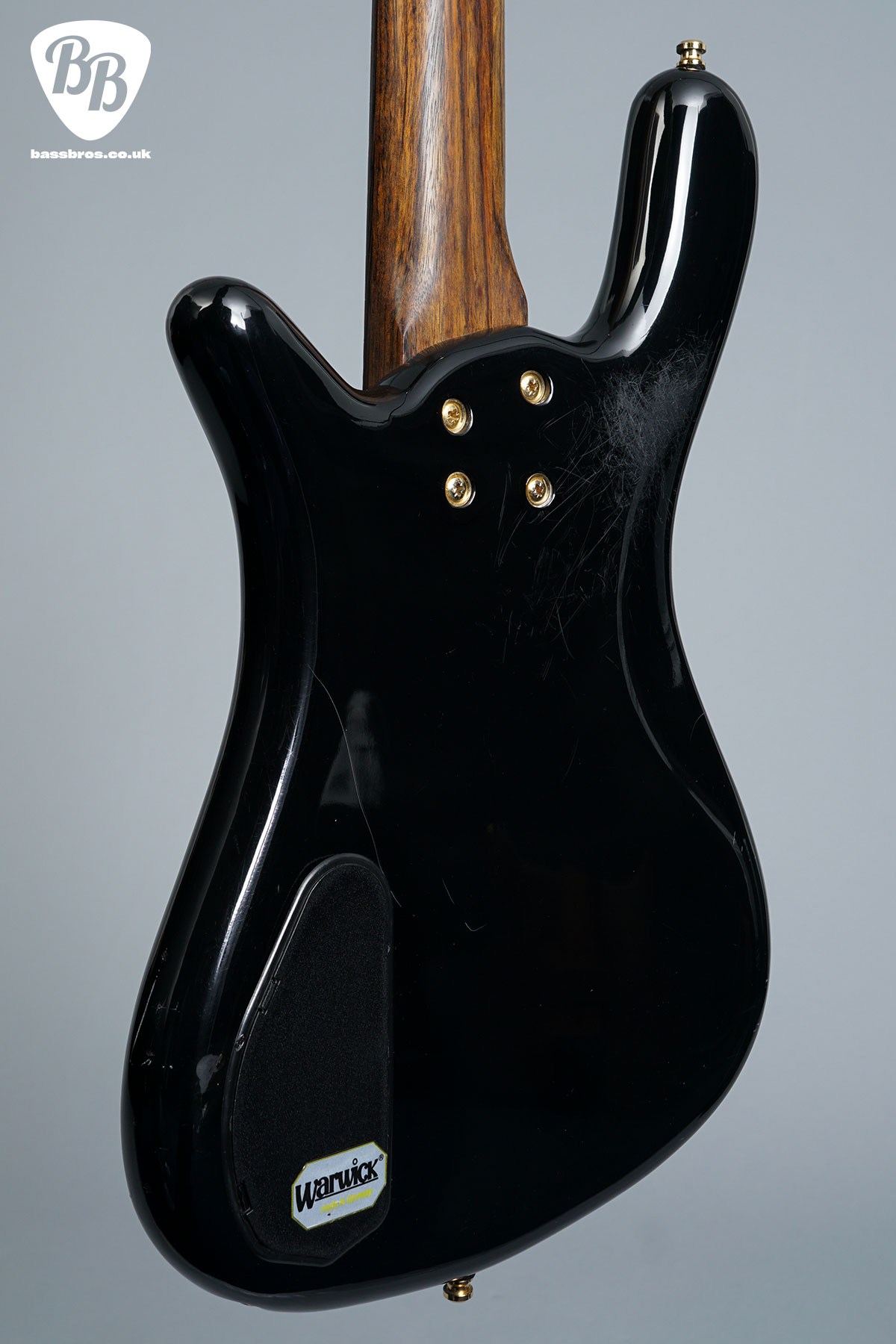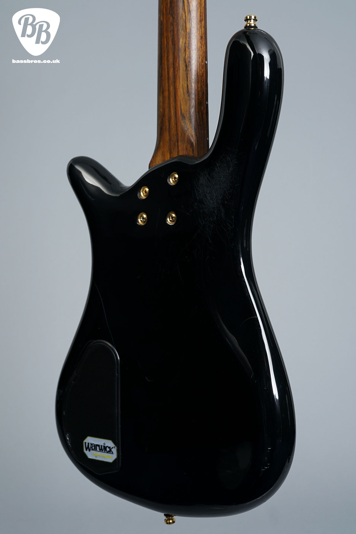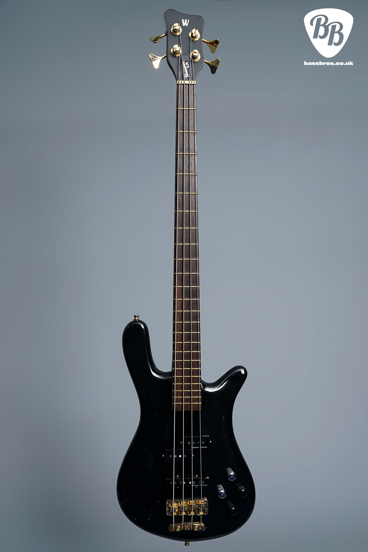 Here is a German made Warwick LX4 in black gloss finish. There are a lot of marks to the body throughout, as well as dings to the front, and a lot of scratching to the finish on the back. The pickups have been replaced with a set of Seymour Duncan pickups and the preamp has been changed to a Glokenklang preamp. The control knobs have also been changed. We have fully tested the electronics and trussrod and everything works perfectly.