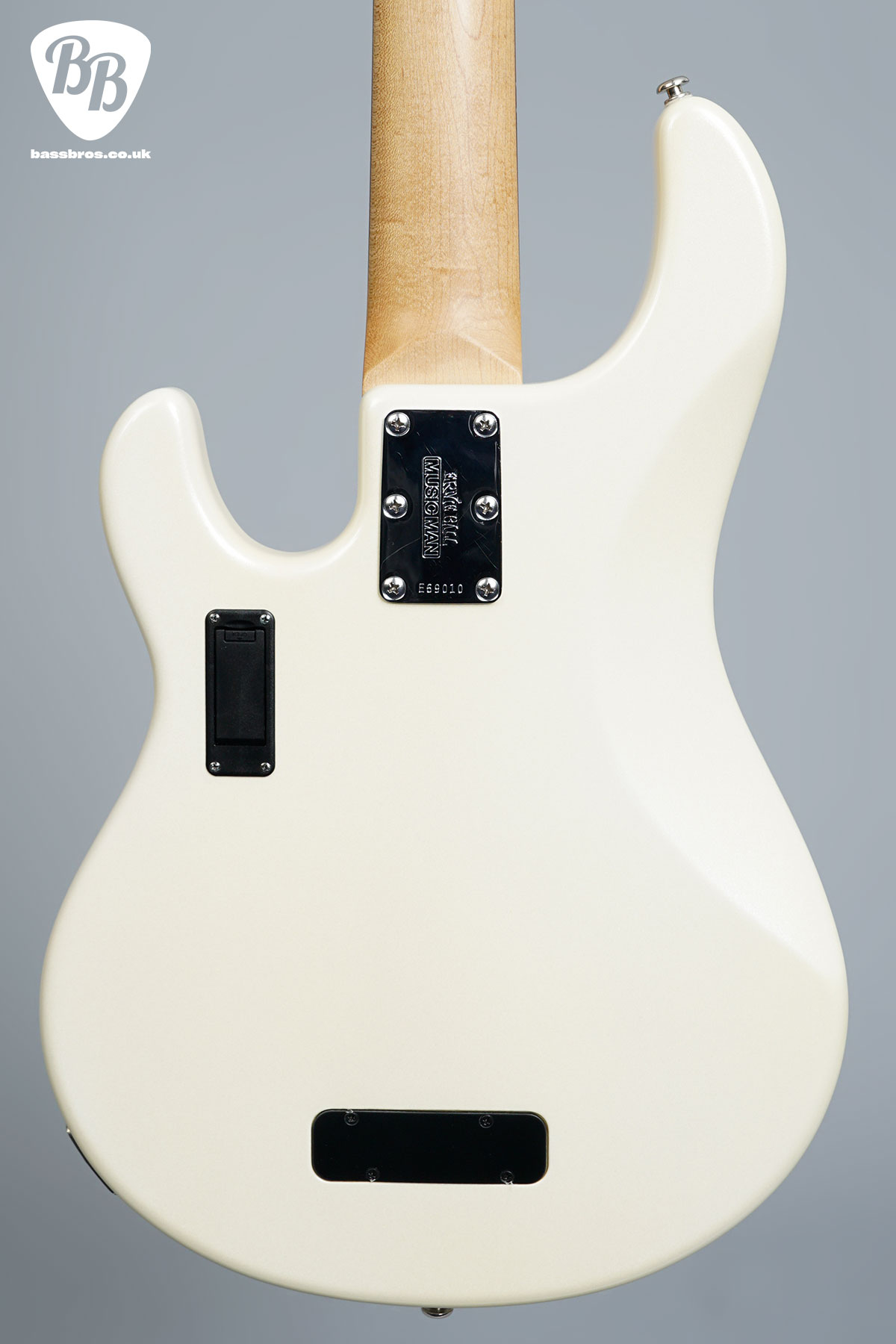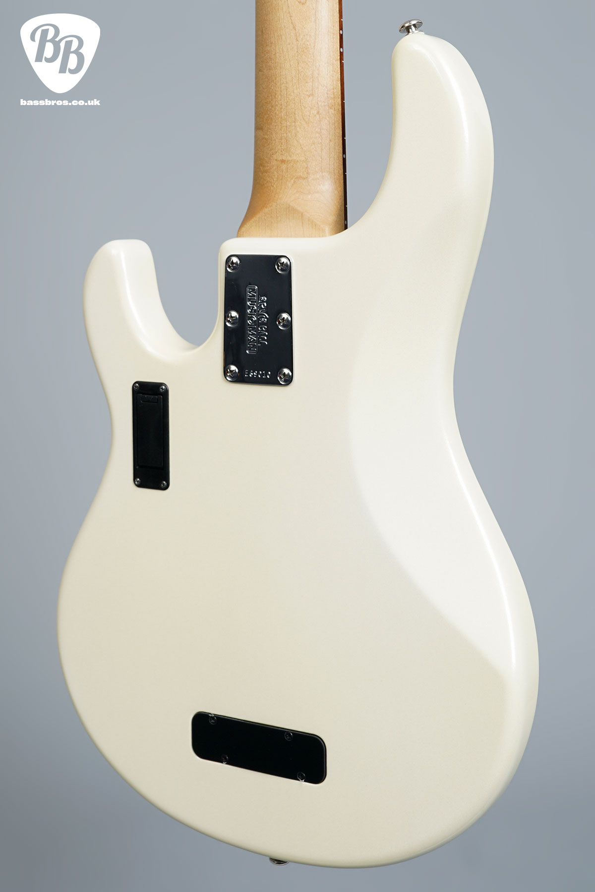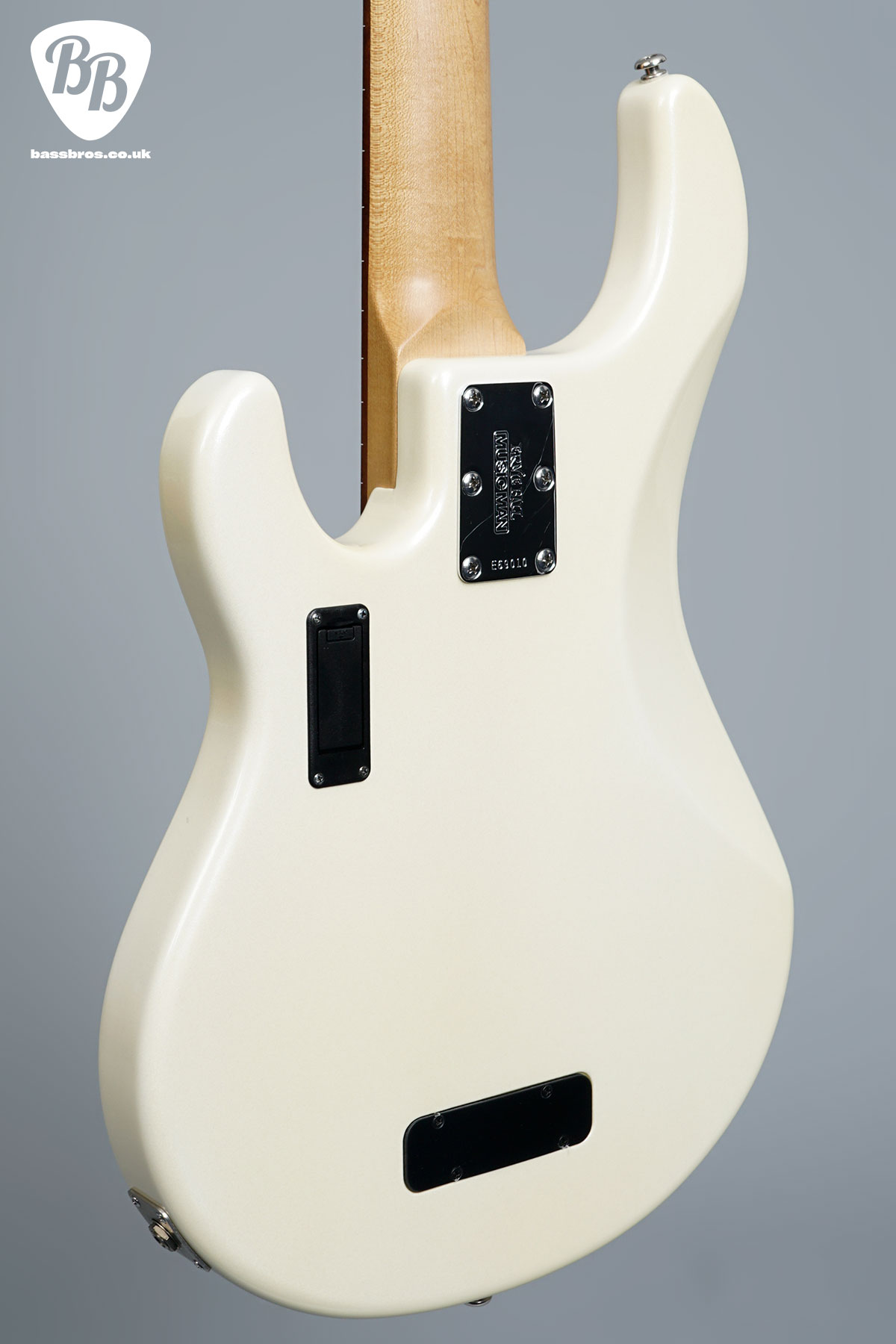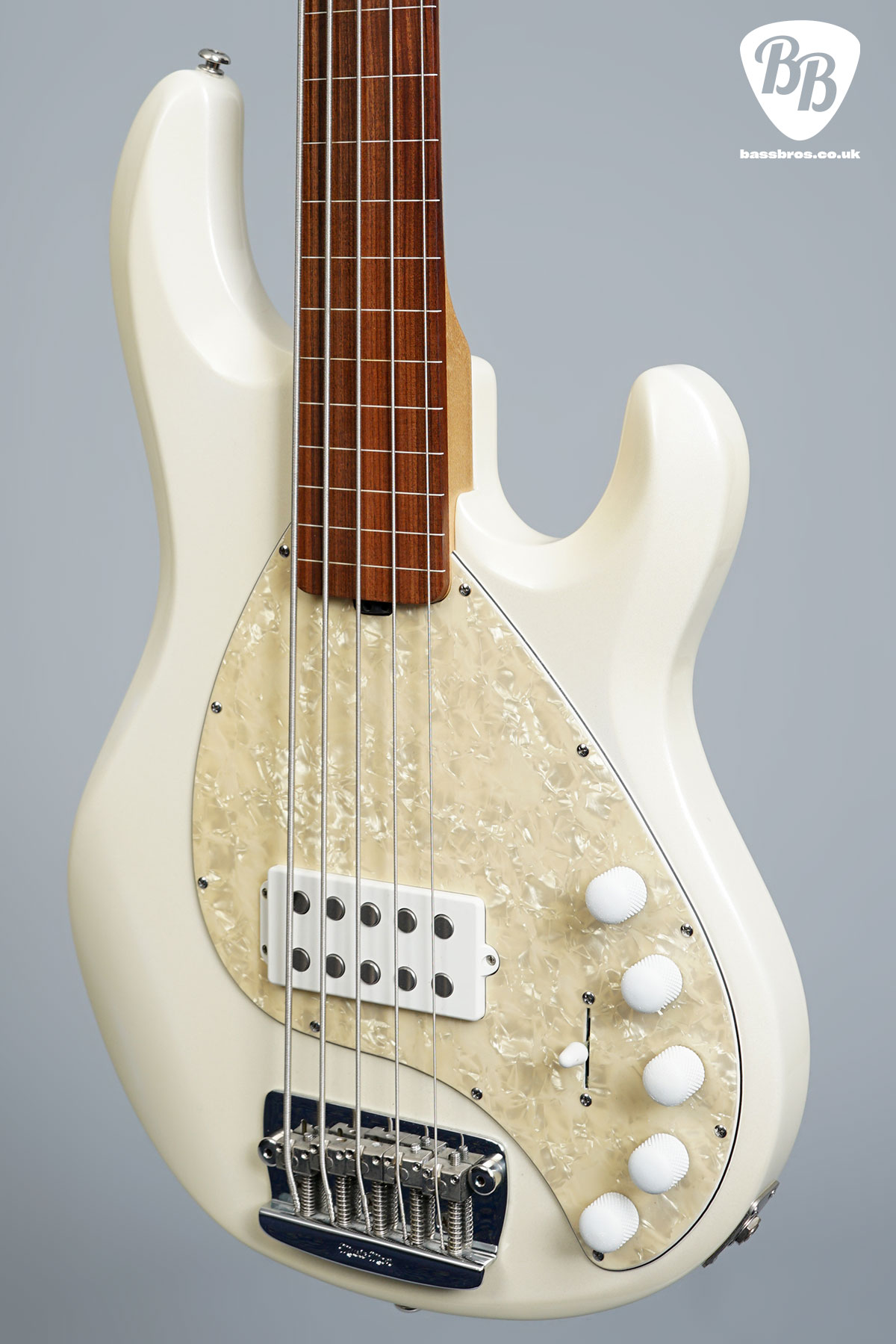 A fantasitc 2008 Ernie Ball Music Man Stingray 5 Fretless Piezo in pearl white! It is in very good condition for its age with no marks or damage, just a tiny crack in the lacquer at the neck pocket, nothing out of the ordinary. The knobs have been painted white which looks great. This bass is fretless and also features the factory fitted piezo pickup at the bridge for even ore tone versatility! We have given the bass a full checkover and everything works perfectly, including the trussrod and electronics. Included is a hardcase.