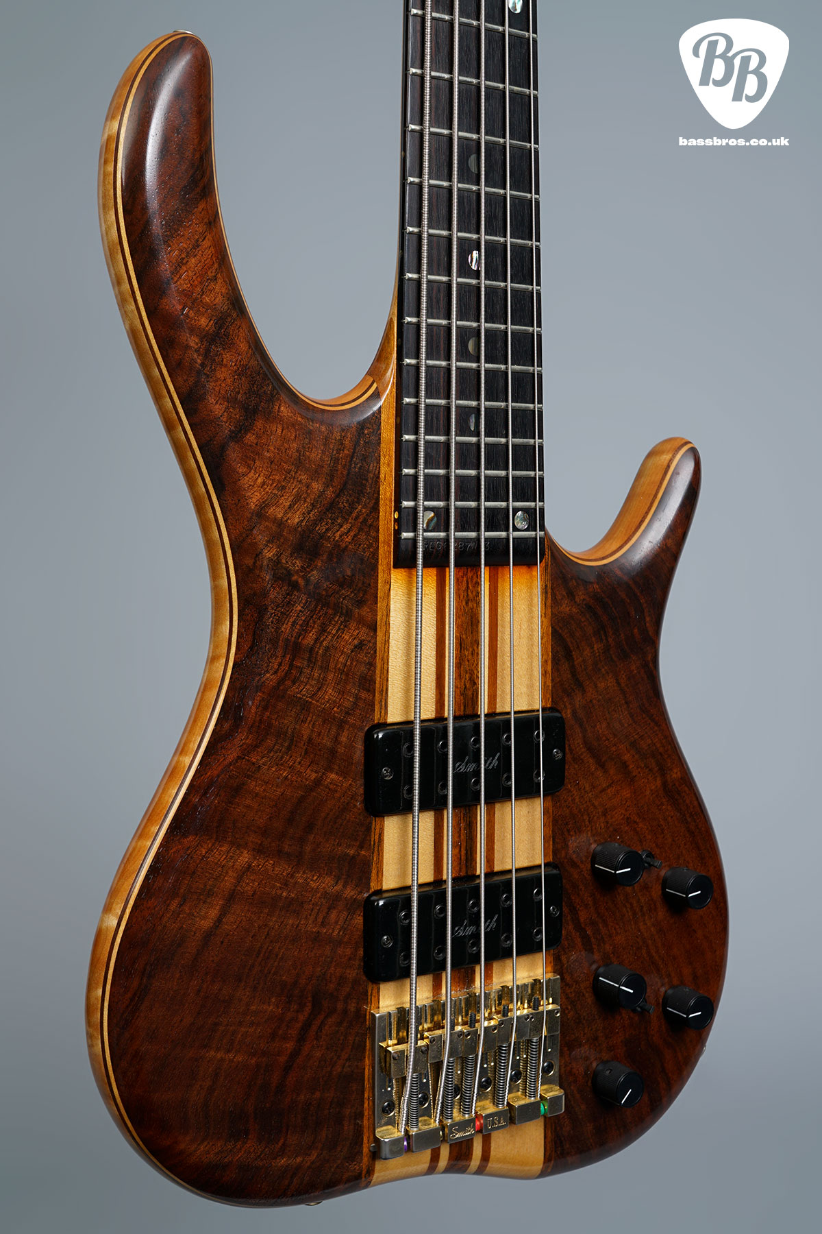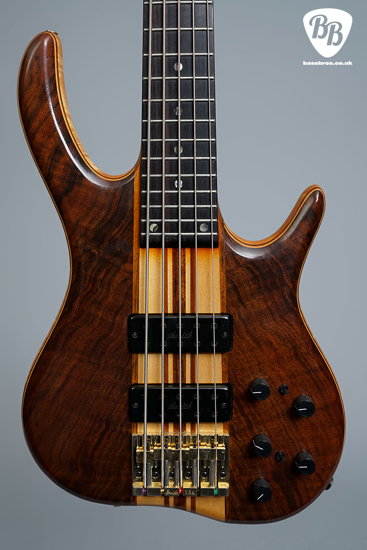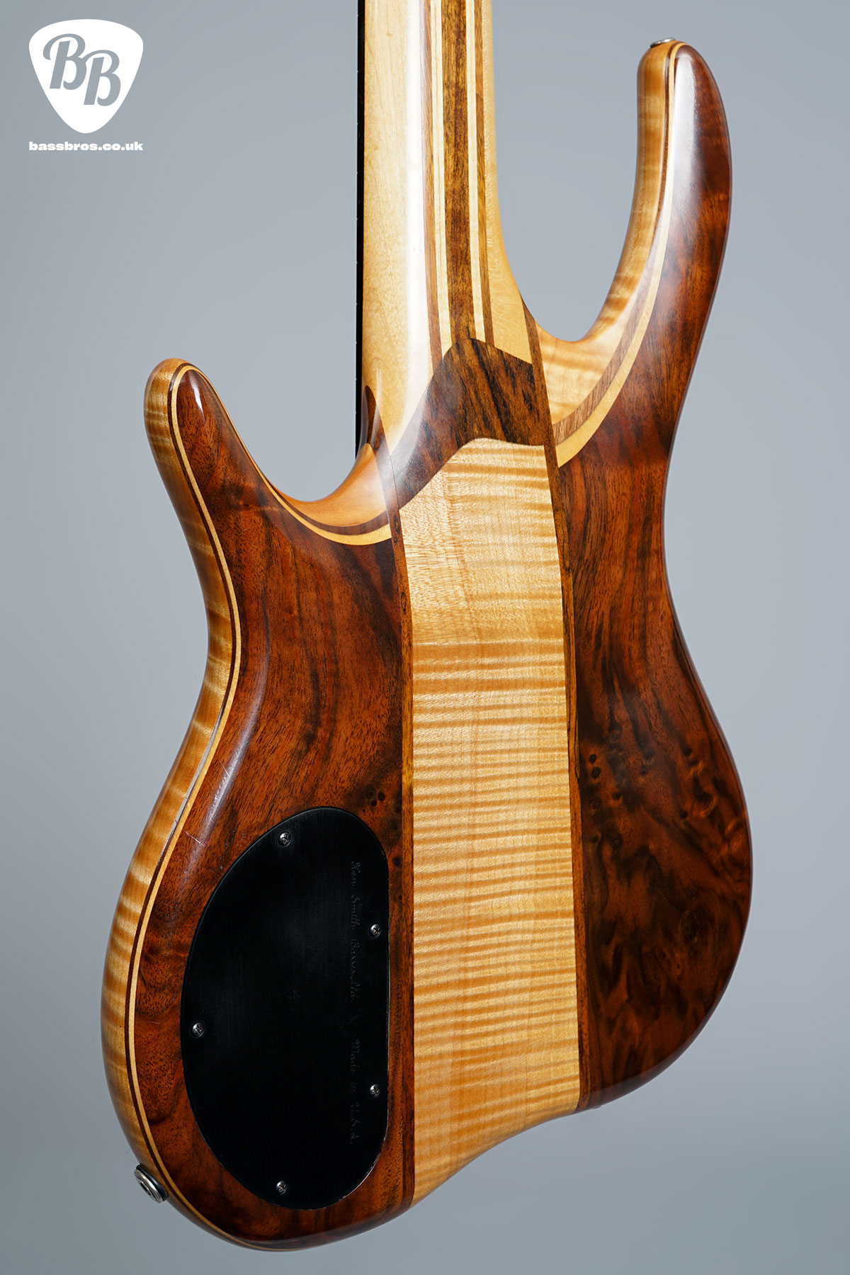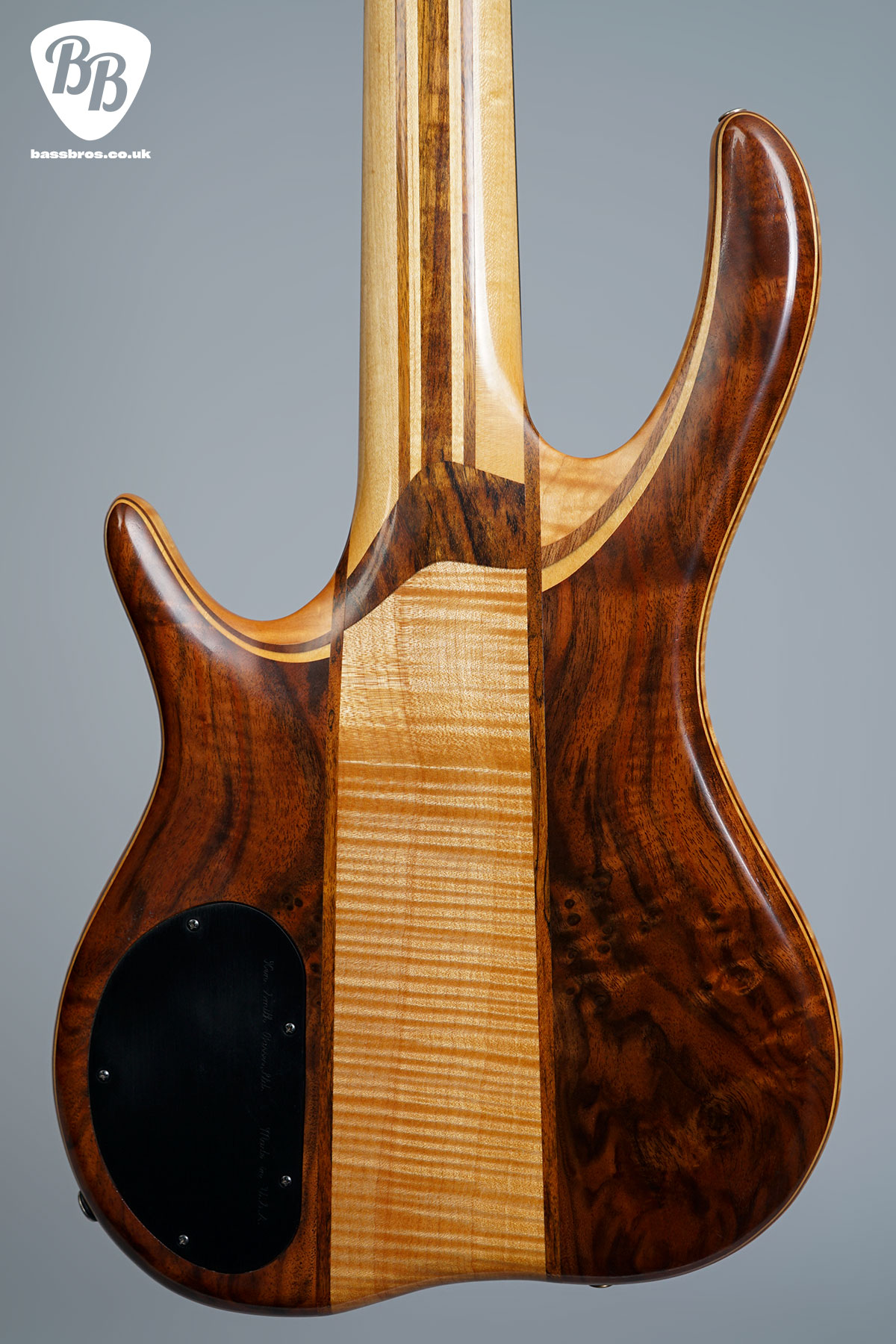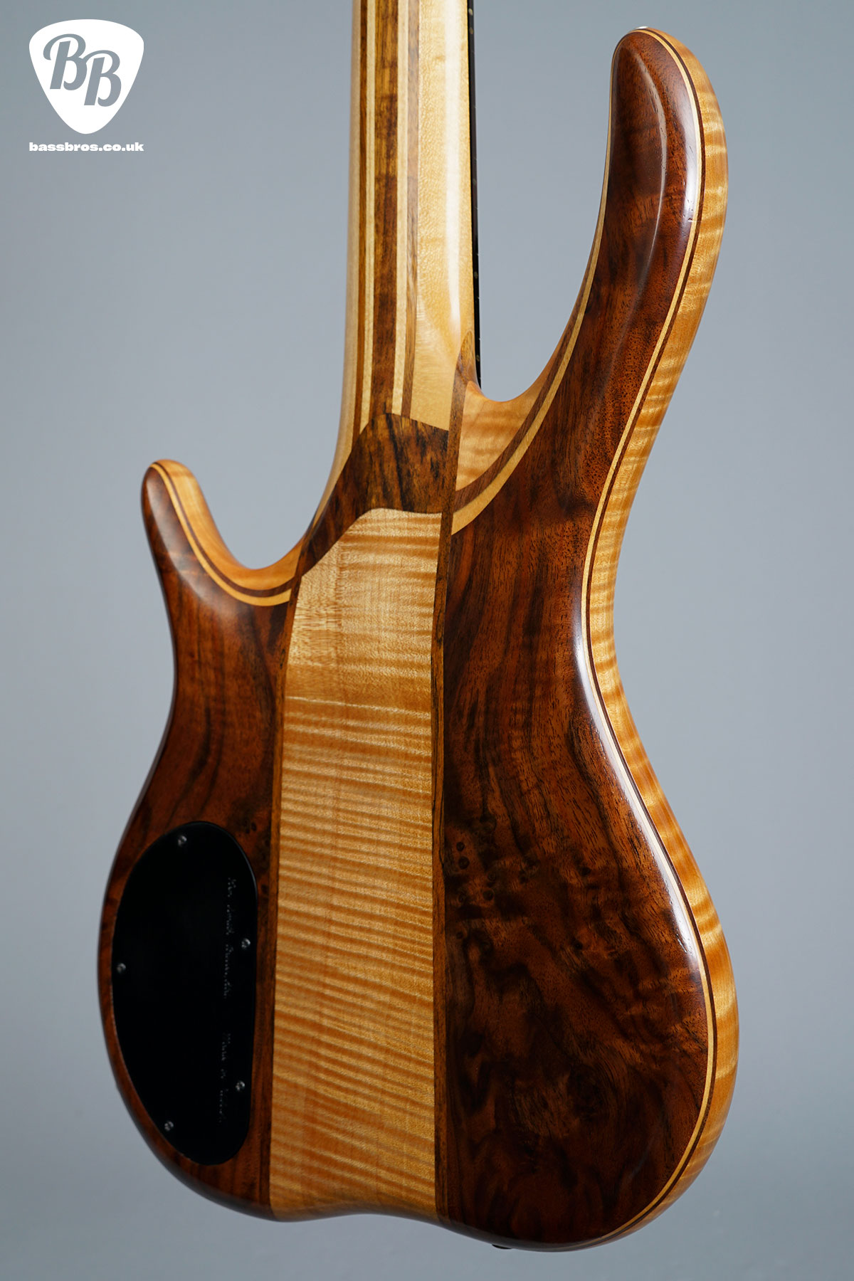Here we have a stunning 2013 Ken Smith BSR5 Elite 7/7 with beautiful Crotch Walnut facings! This is a great opportunity to get hold of one of these basses on the secondhand market which rarely come up! These basses feature a 7 piece maple and bubinga neck, and 7 piece maple and walnut body. This one is in excellent condition with some tiny marks and signs of use, and a tiny spot of lacquer peel on the back of the neck on the 6th fret, but it is not very noticeable. The oiled finish has slightly glossed up after years of use. Everything is in good working order including the electronics and the trussrod. Included is the original hardcase.