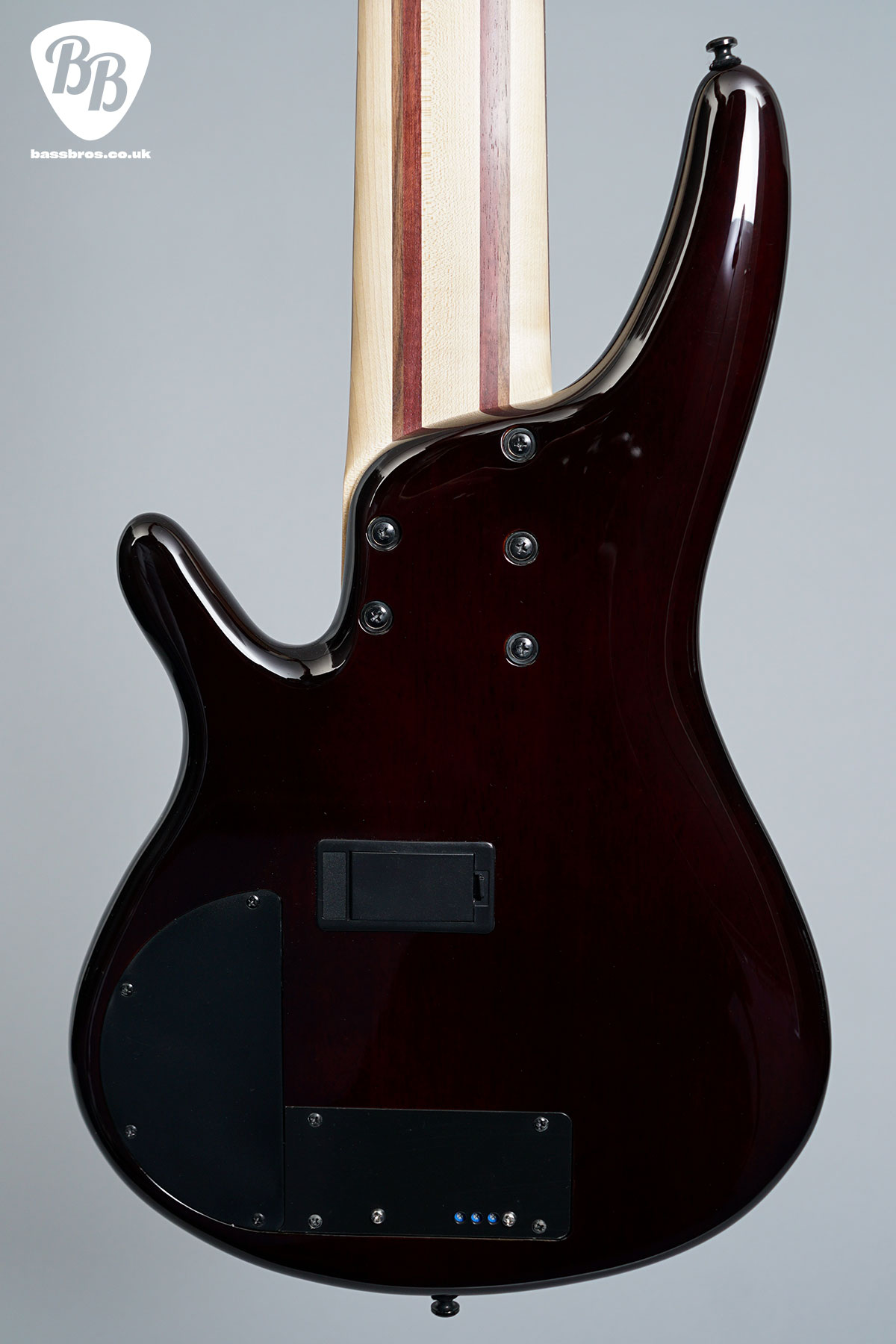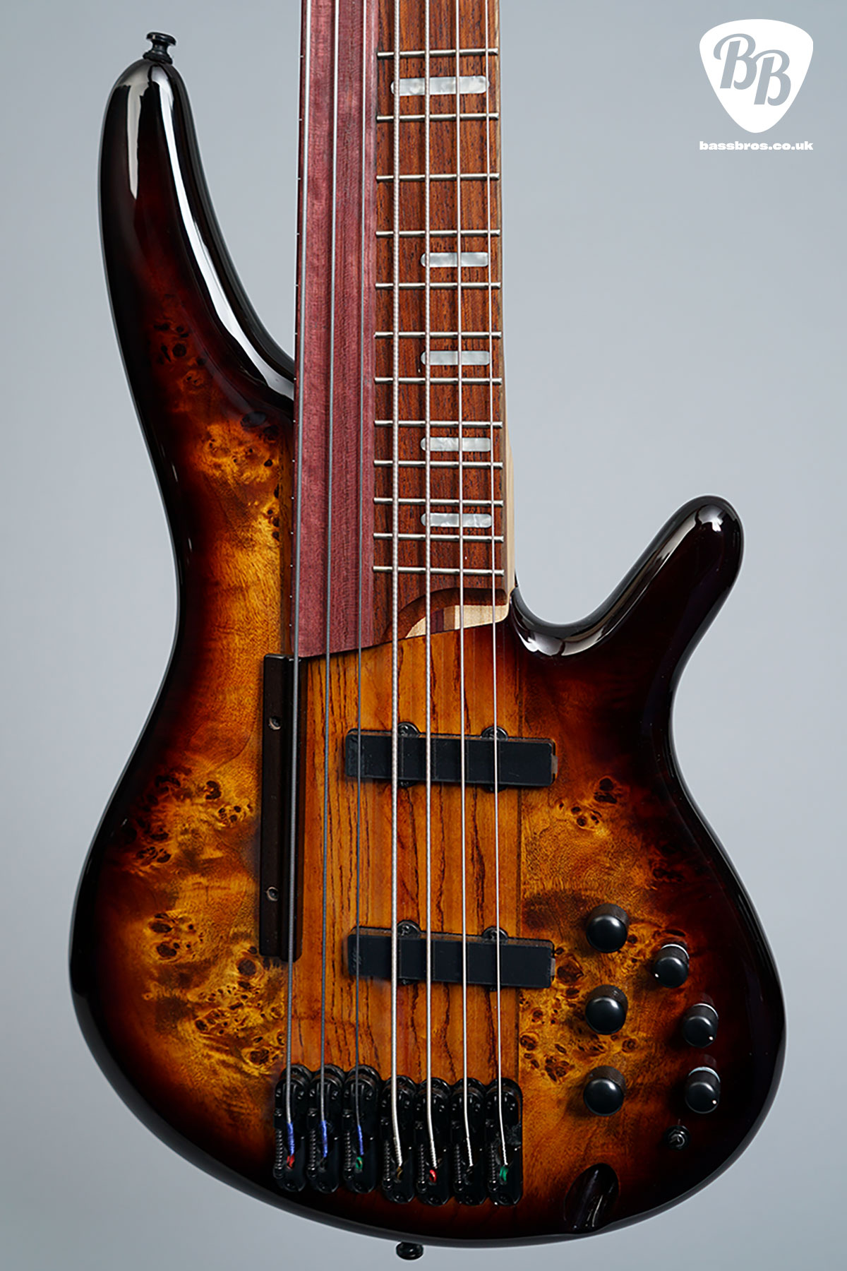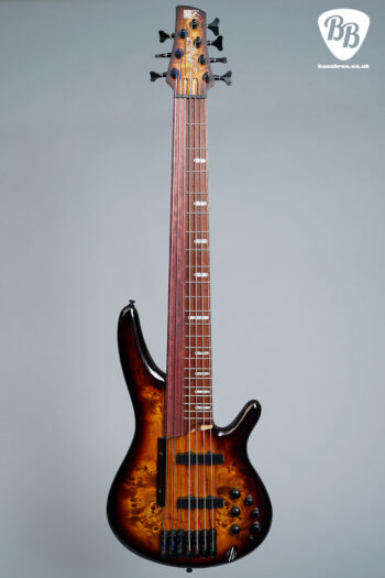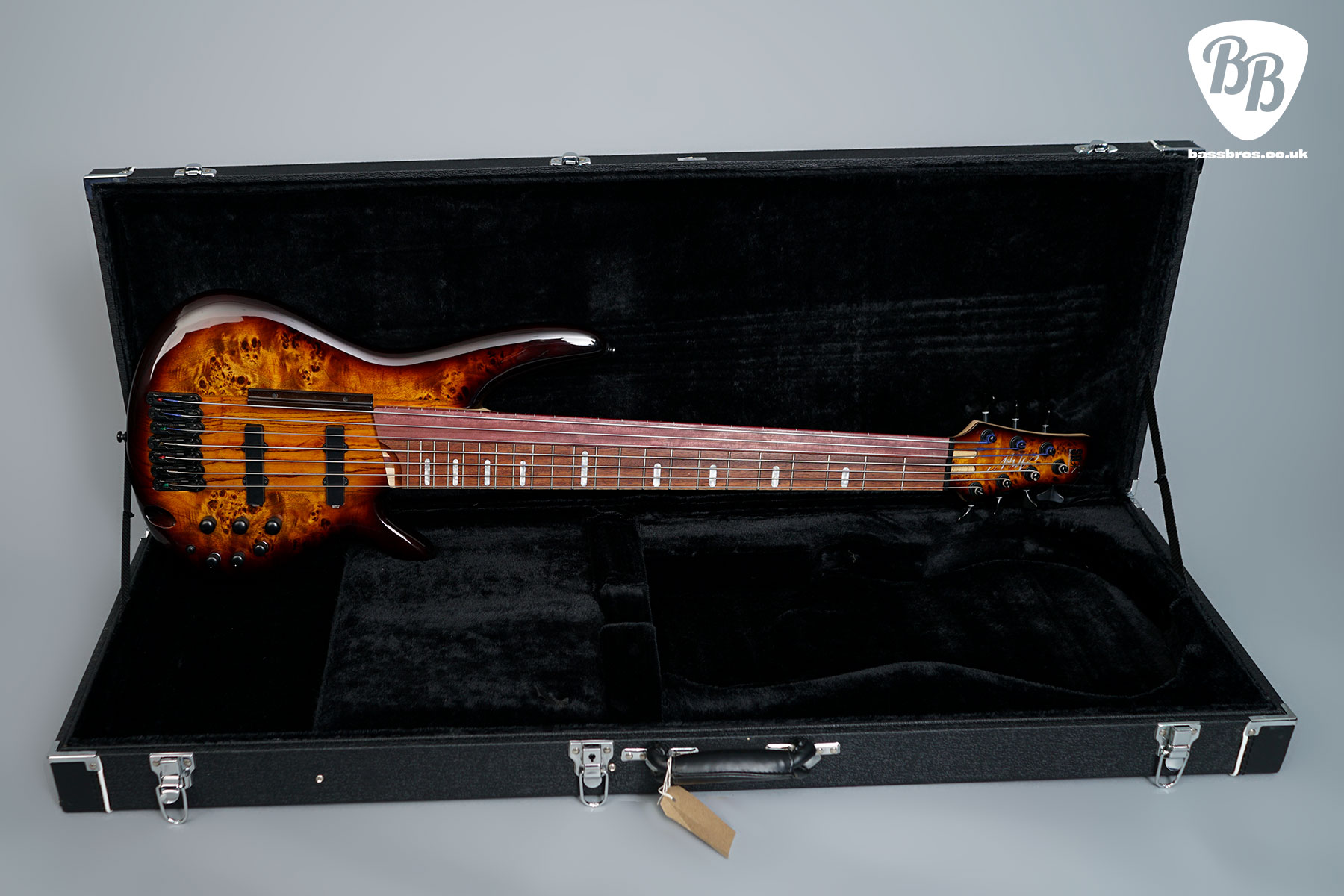 The SRAS7 features a poplar burl and ash top on a double-cutaway mahogany body bolted to a seven-piece maple, rosewood, and purpleheart neck. The fretboard consists of a fretless upper (bass) section made of rosewood and an 22-fret lower (treble) section made of purpleheart with offset pearloid stadium position markers. Components include 2 Super J pick-ups and an AeroSilk piezo for the fretless part of the instrument as well as Mono-Rail V bridges with 16mm string spacing and a walnut finger rest. A pick-up selector allows the user to switch between regular pick-ups, piezo, or mix. The bass is in great condition with little sign of wear. Included is a hardcase.