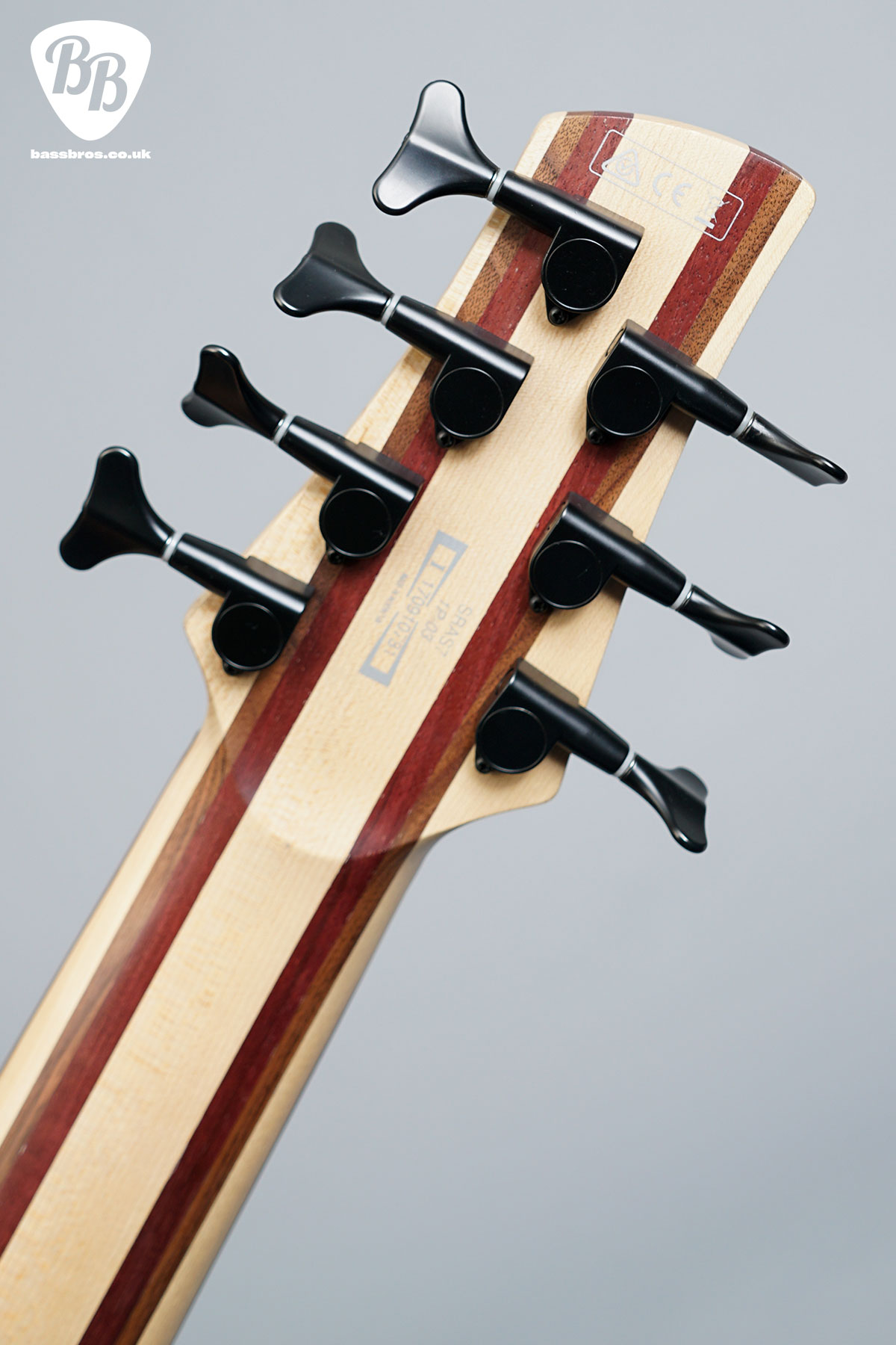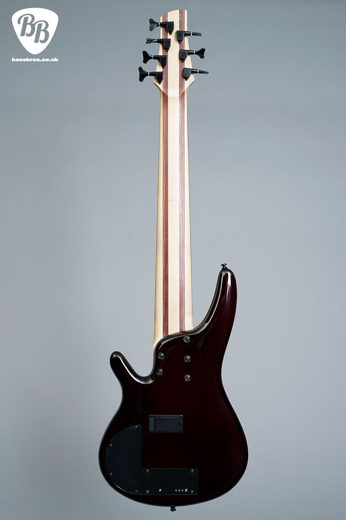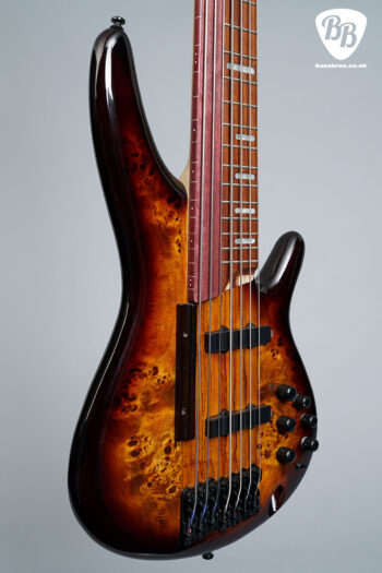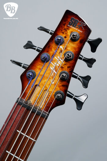 The SRAS7 features a poplar burl and ash top on a double-cutaway mahogany body bolted to a seven-piece maple, rosewood, and purpleheart neck. The fretboard consists of a fretless upper (bass) section made of rosewood and an 22-fret lower (treble) section made of purpleheart with offset pearloid stadium position markers. Components include 2 Super J pick-ups and an AeroSilk piezo for the fretless part of the instrument as well as Mono-Rail V bridges with 16mm string spacing and a walnut finger rest. A pick-up selector allows the user to switch between regular pick-ups, piezo, or mix. The bass is in great condition with little sign of wear. Included is a hardcase.