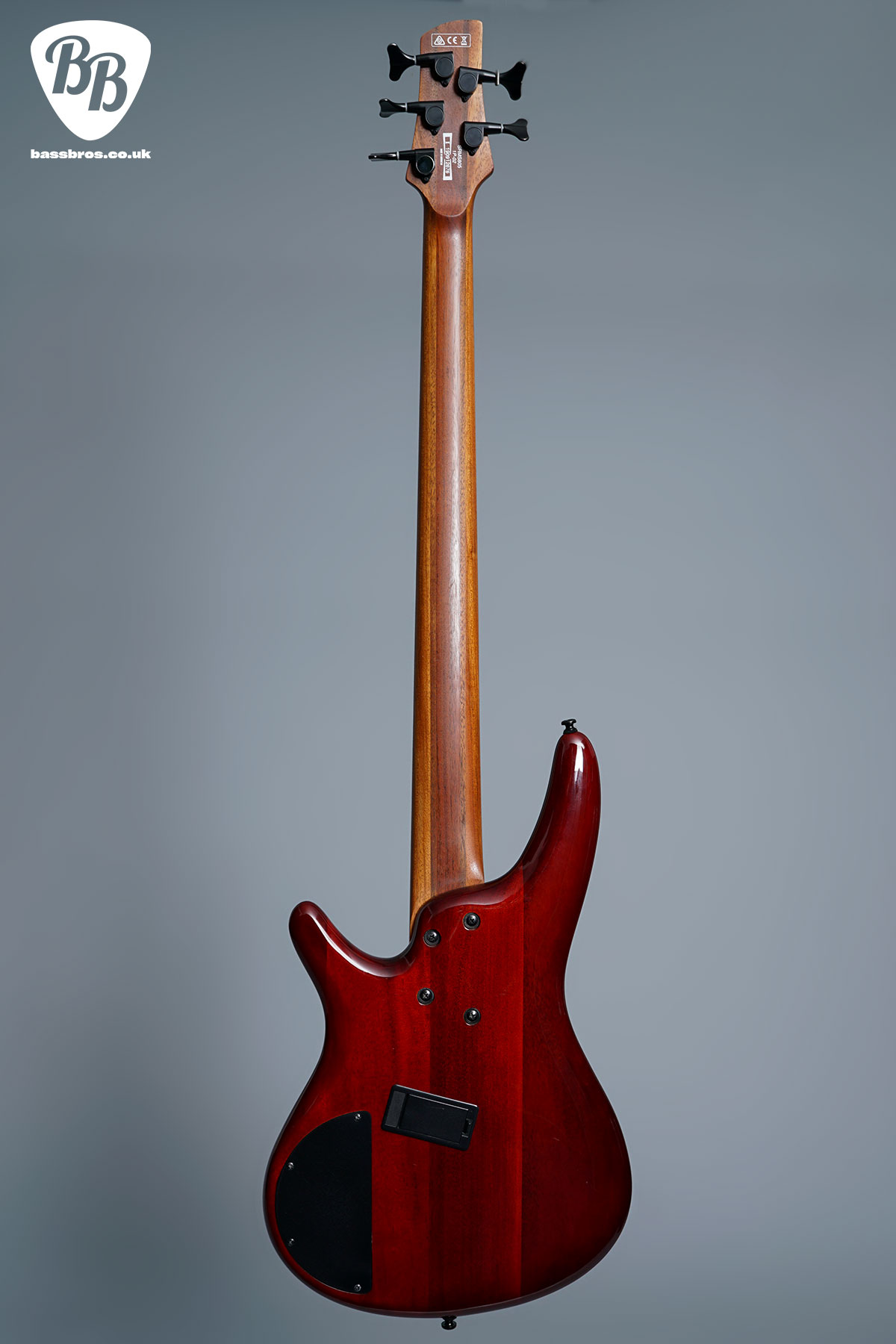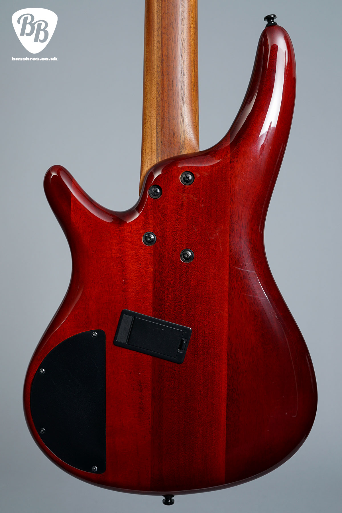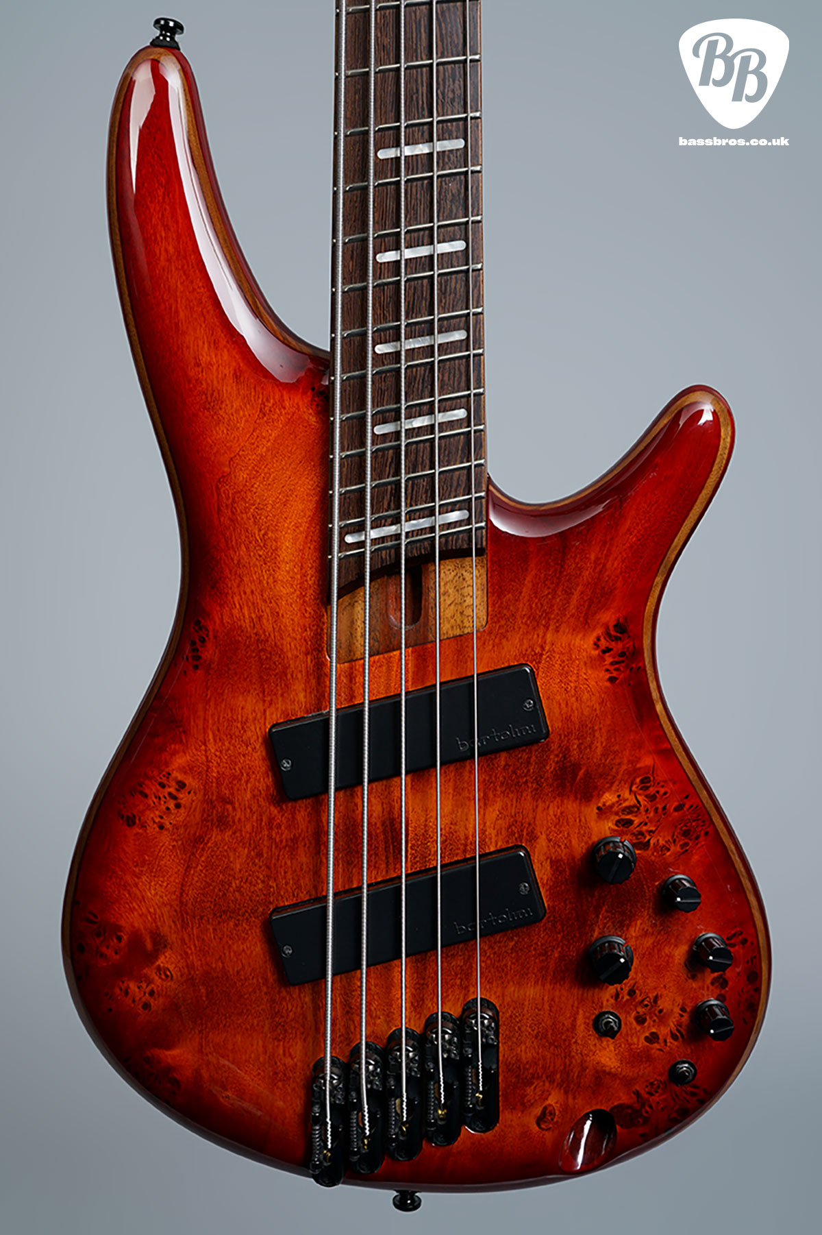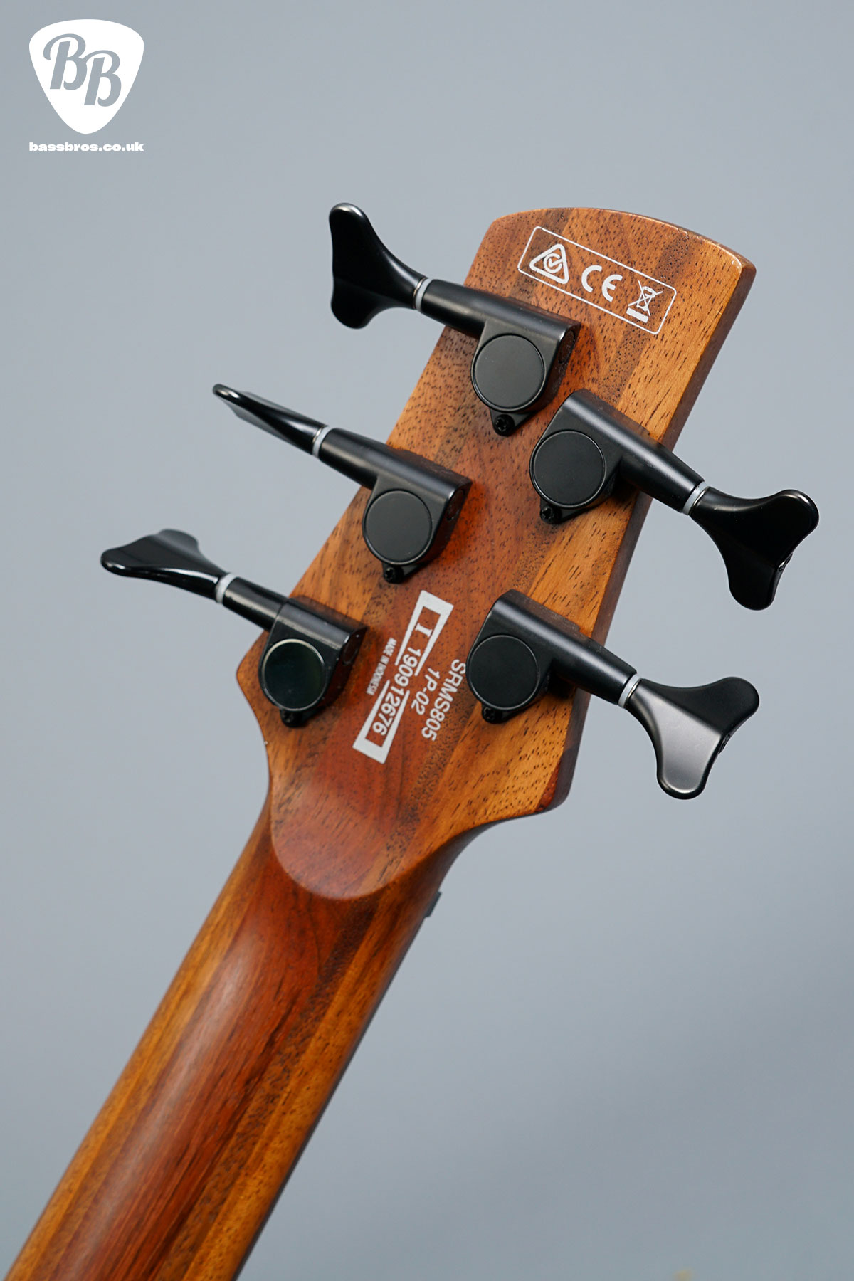 The SRMS805 features a poplar burl top on a double-cutaway walnut and mahogany body bolted to a jatoba and walnut multi-scale neck with a 24-fret panga panga fingerboard with offset stadium position markers. Components include a pair of Bartolini BH2 passive pickups feeding an Ibanez custom preamp with a three-band EQ, individually mounted Mono-rail 5S bridges with adjustable 16.5mm string spacing, a plastic nut, and Ibanez tuning machines. This bass is in very good condition with some minor chips and marks throughout the bass, but nothing major. We have fully tested and checked over this bass, all works perfectly including the electrics.