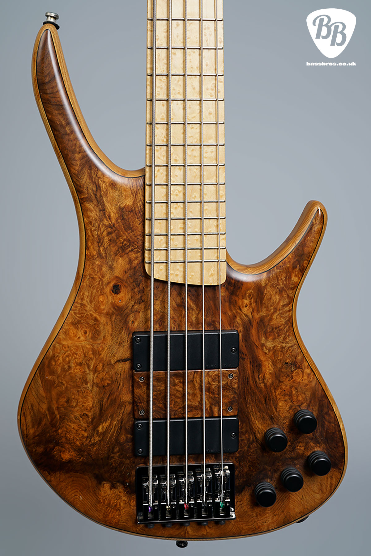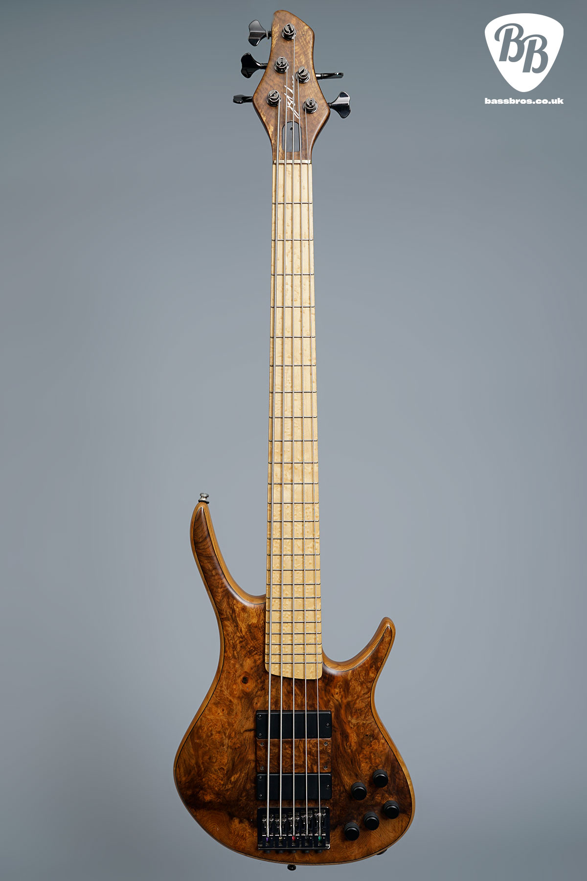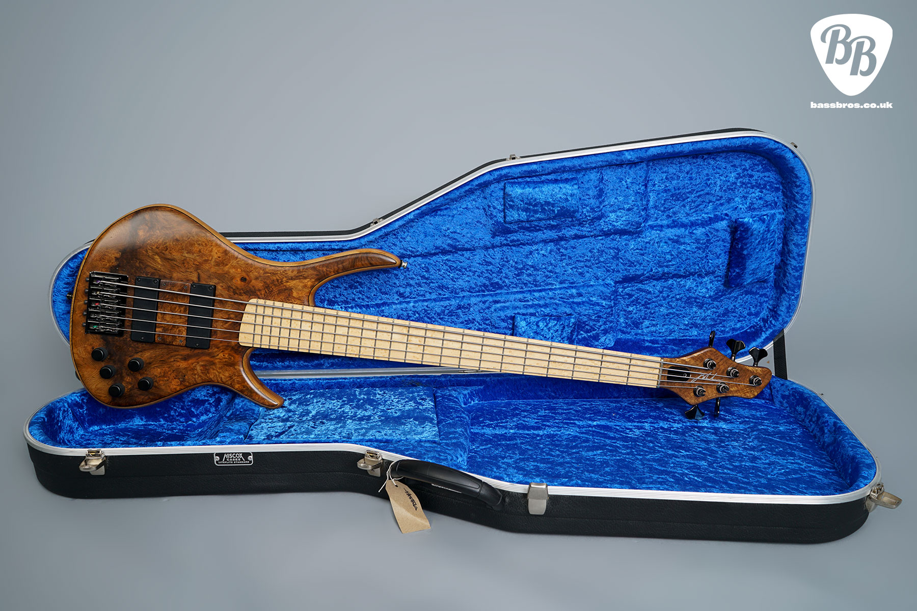 A wonderful 33″ scale custom bass from Shuker! This one features a gorgeous walnut burl top. Also fitted are a set of Delano pickups, and preamp with the adjustable mid switch. The switch is currently in the backplate of the bass, but is wired in like normal. The stunning woods used make this bass a real head turner. All in excellent condition with very little signs of wear. Included is a hardcase.