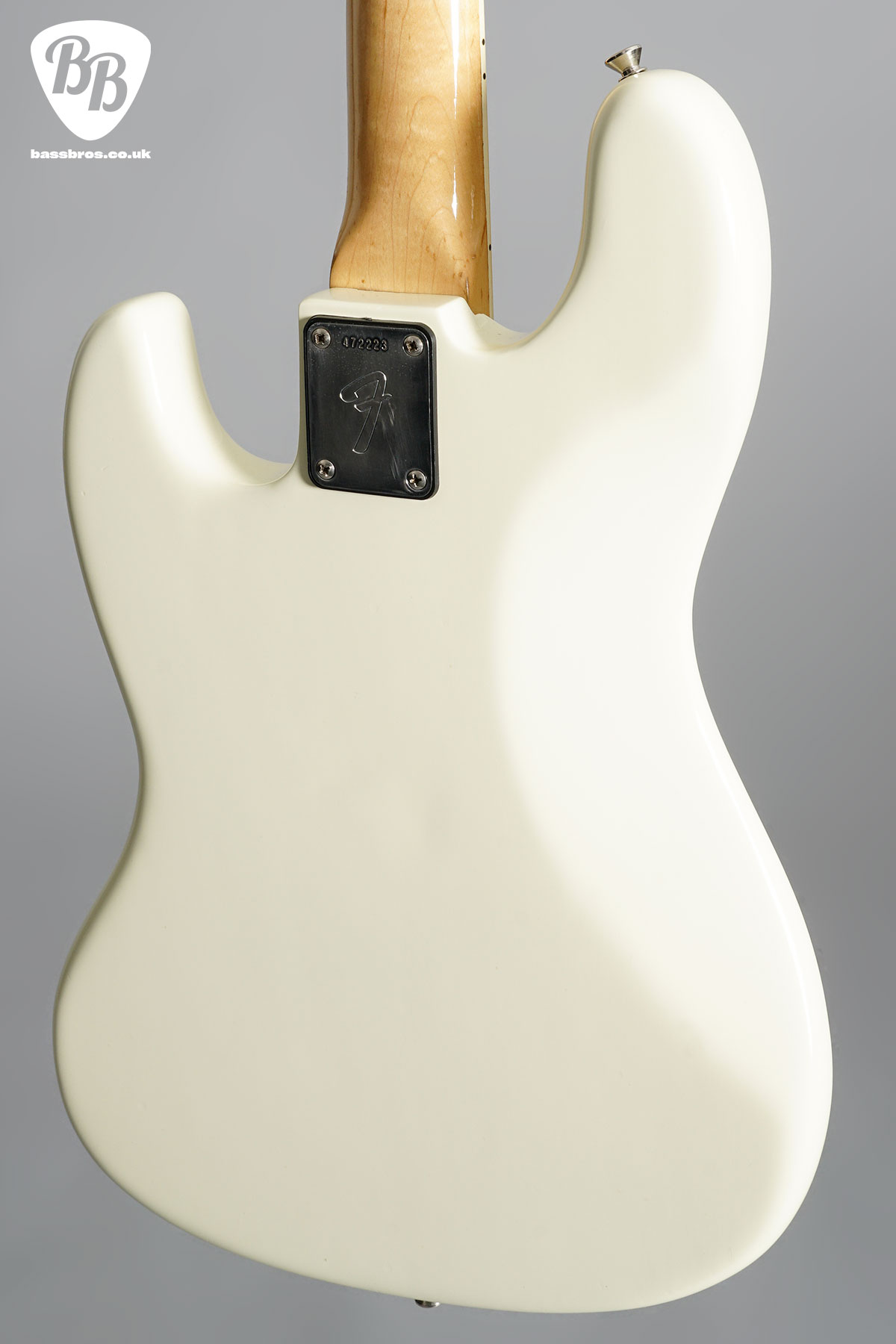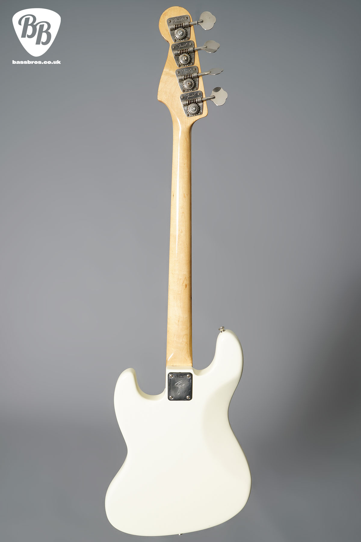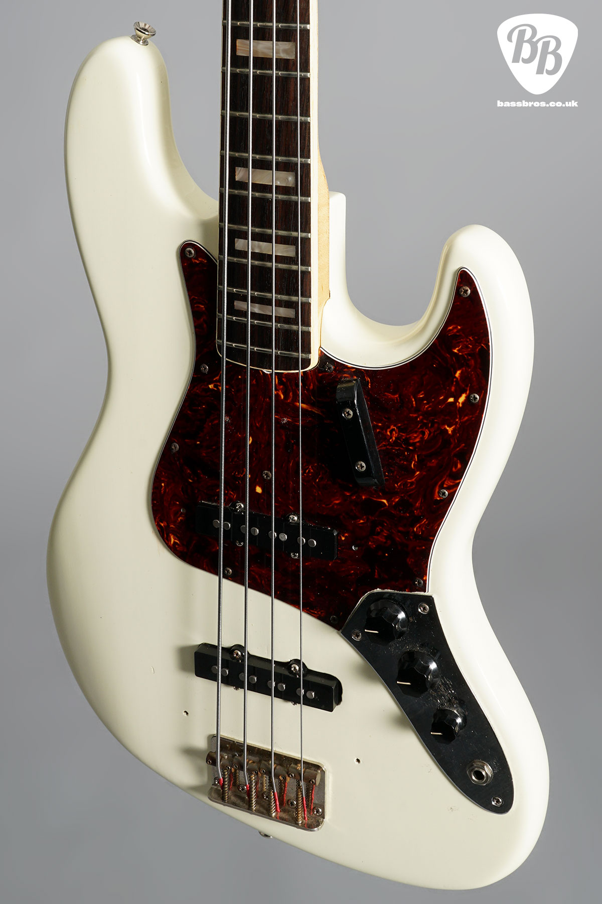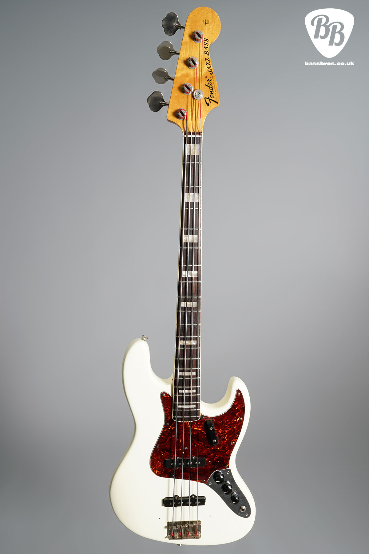 A very nice 1973 Fender Jazz bass with some mojo! This has lots of character, and has been beautifully refinished in olympic white. The pickups have been replaced with a set of Fender Custom Shop pickups, and one pot has been repalced with a modern one, with the other 2 dating to 1973. Everything works as it should including trussrod, electronics. Included is a non original hard case.