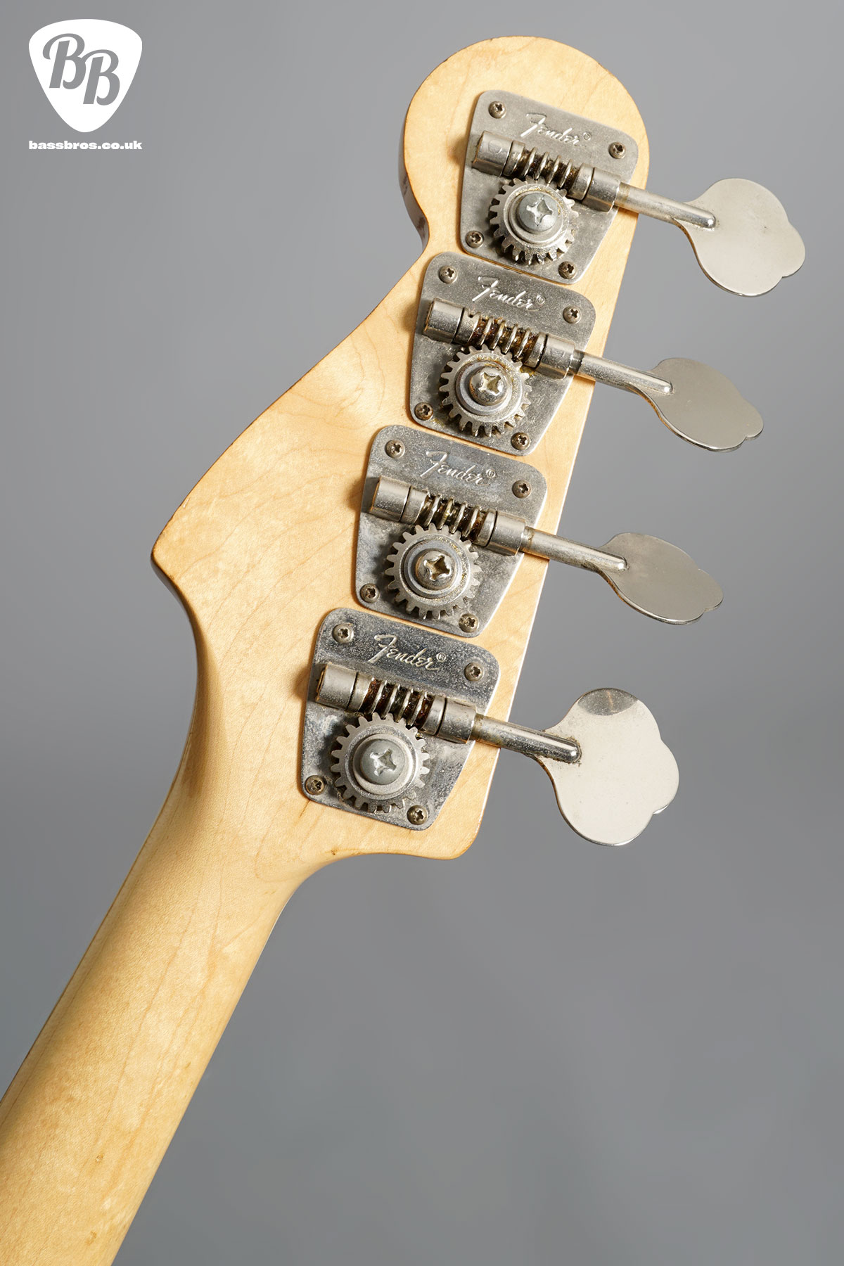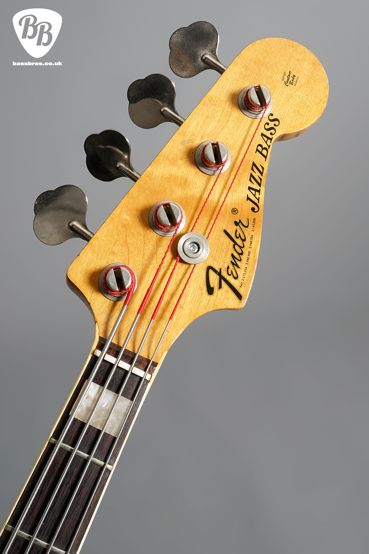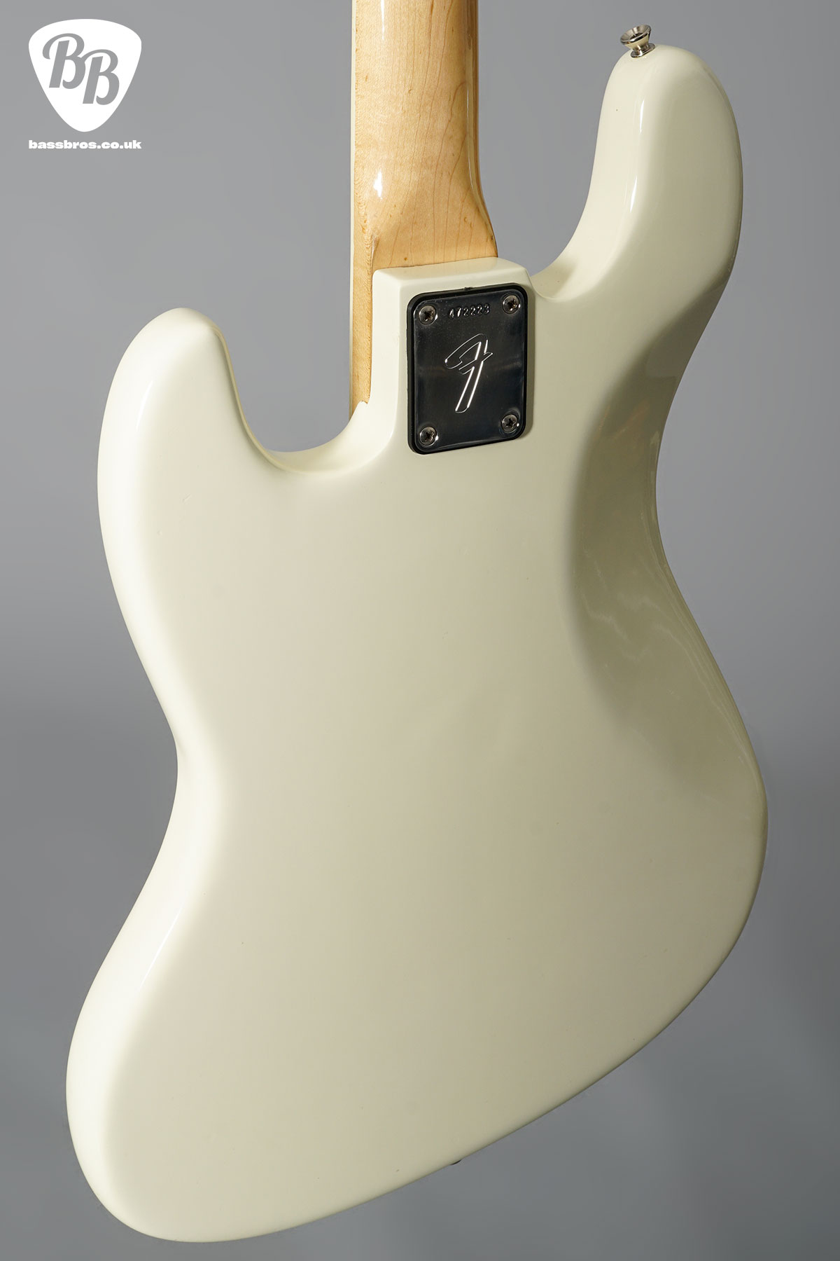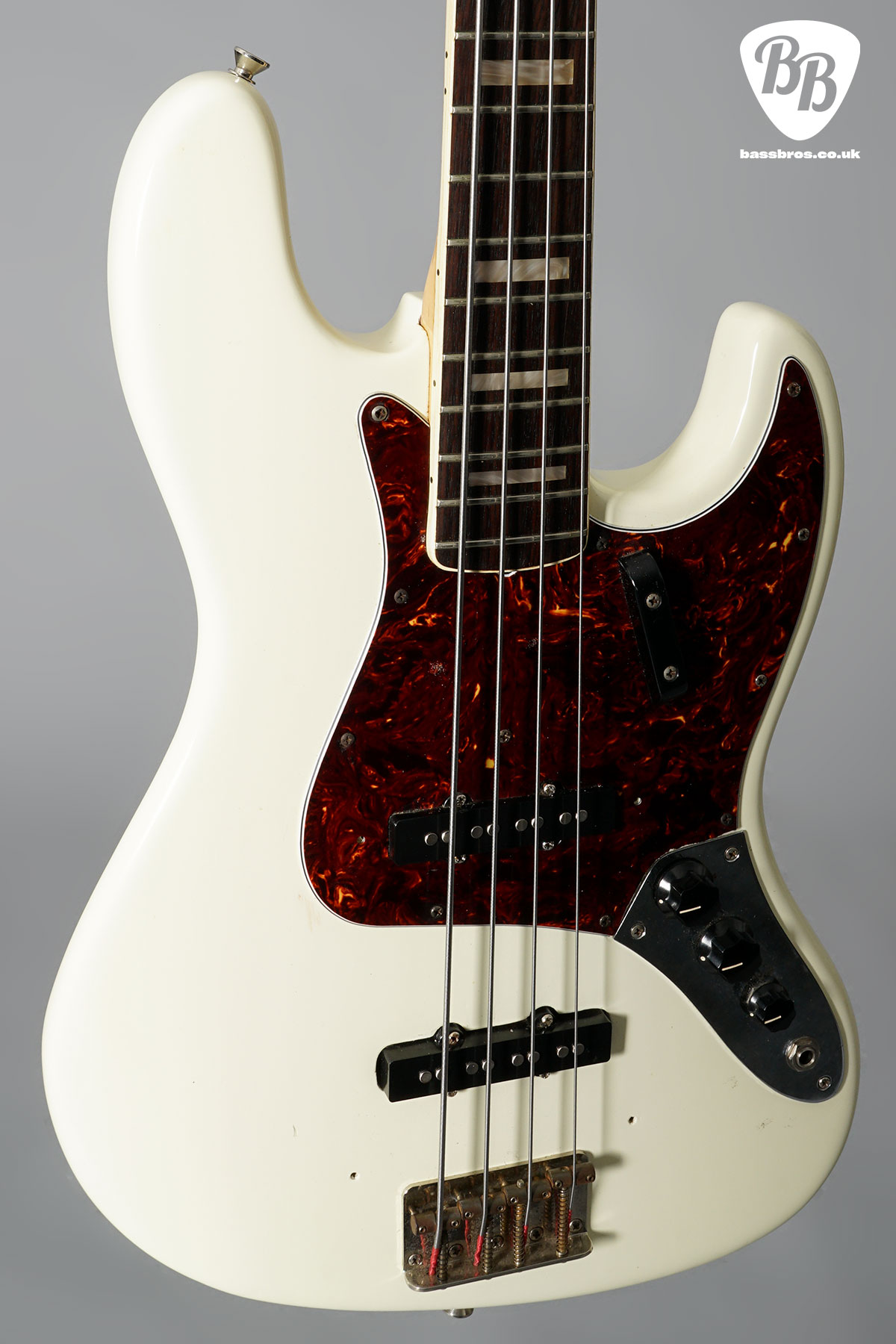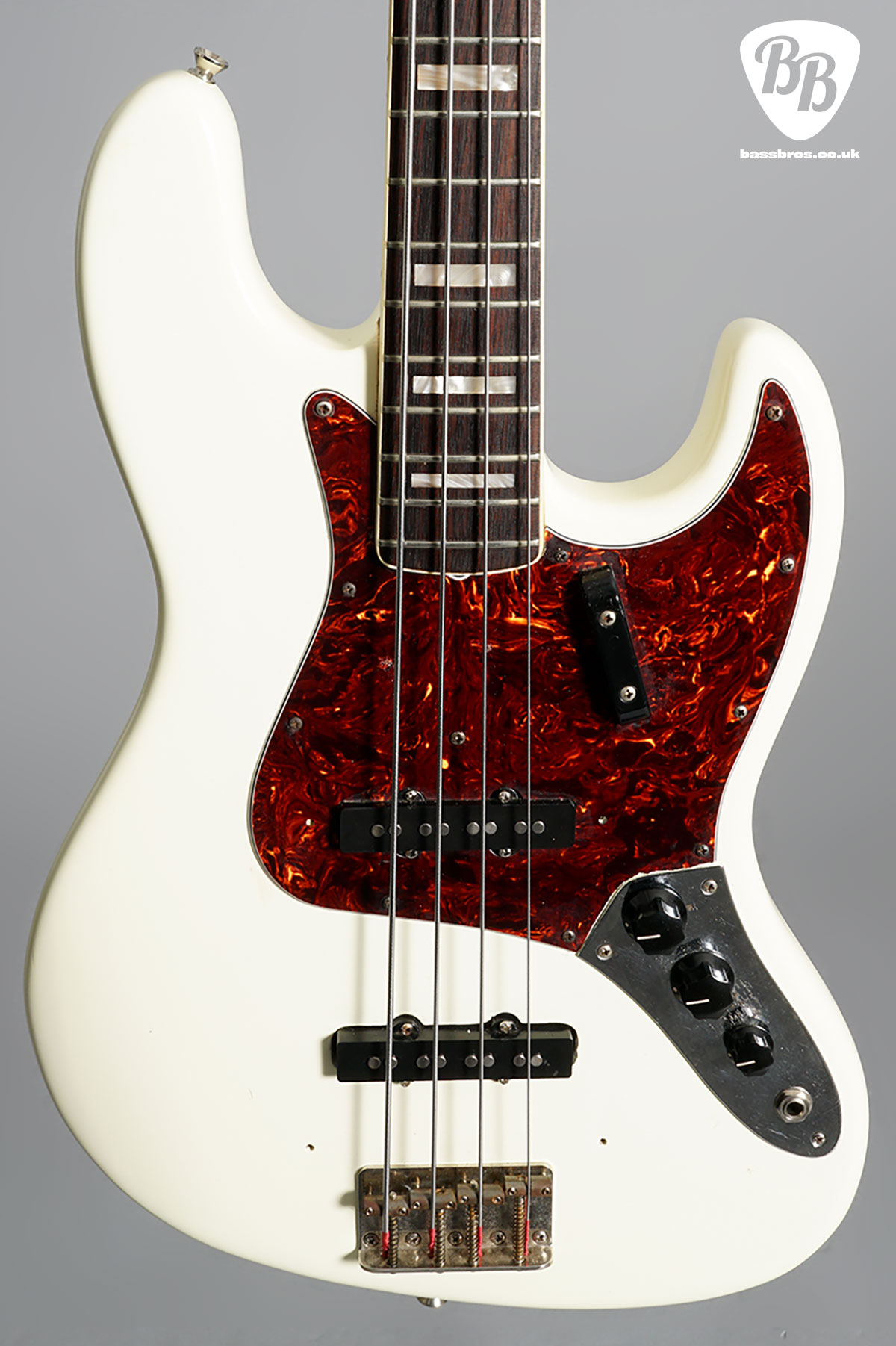 A very nice 1973 Fender Jazz bass with some mojo! This has lots of character, and has been beautifully refinished in olympic white. The pickups have been replaced with a set of Fender Custom Shop pickups, and one pot has been repalced with a modern one, with the other 2 dating to 1973. Everything works as it should including trussrod, electronics. Included is a non original hard case.