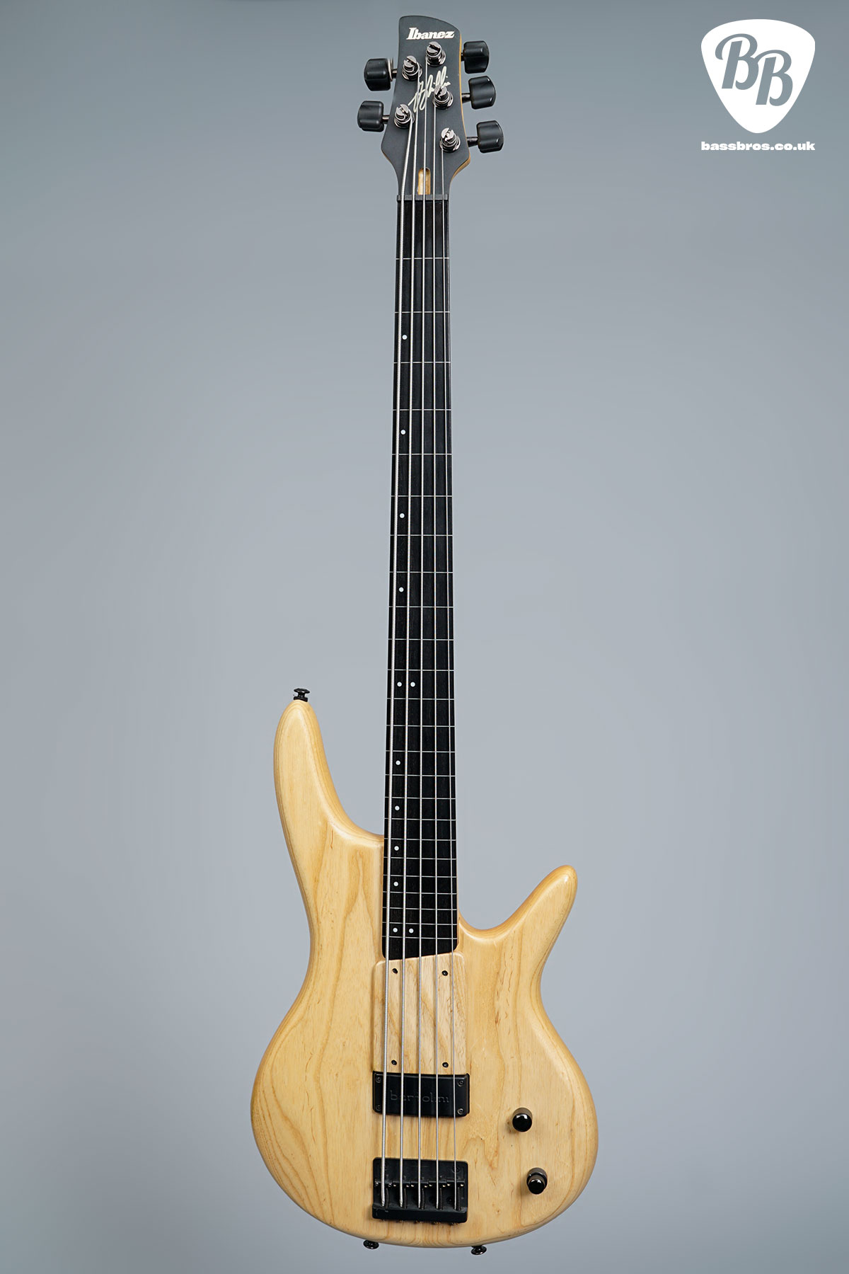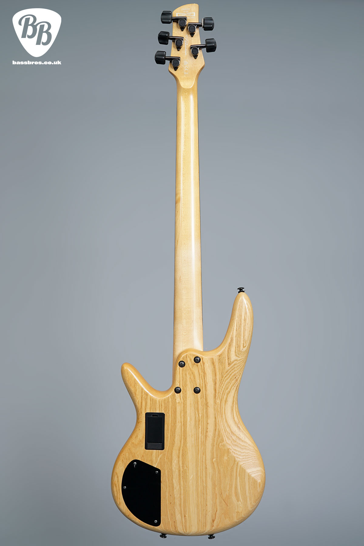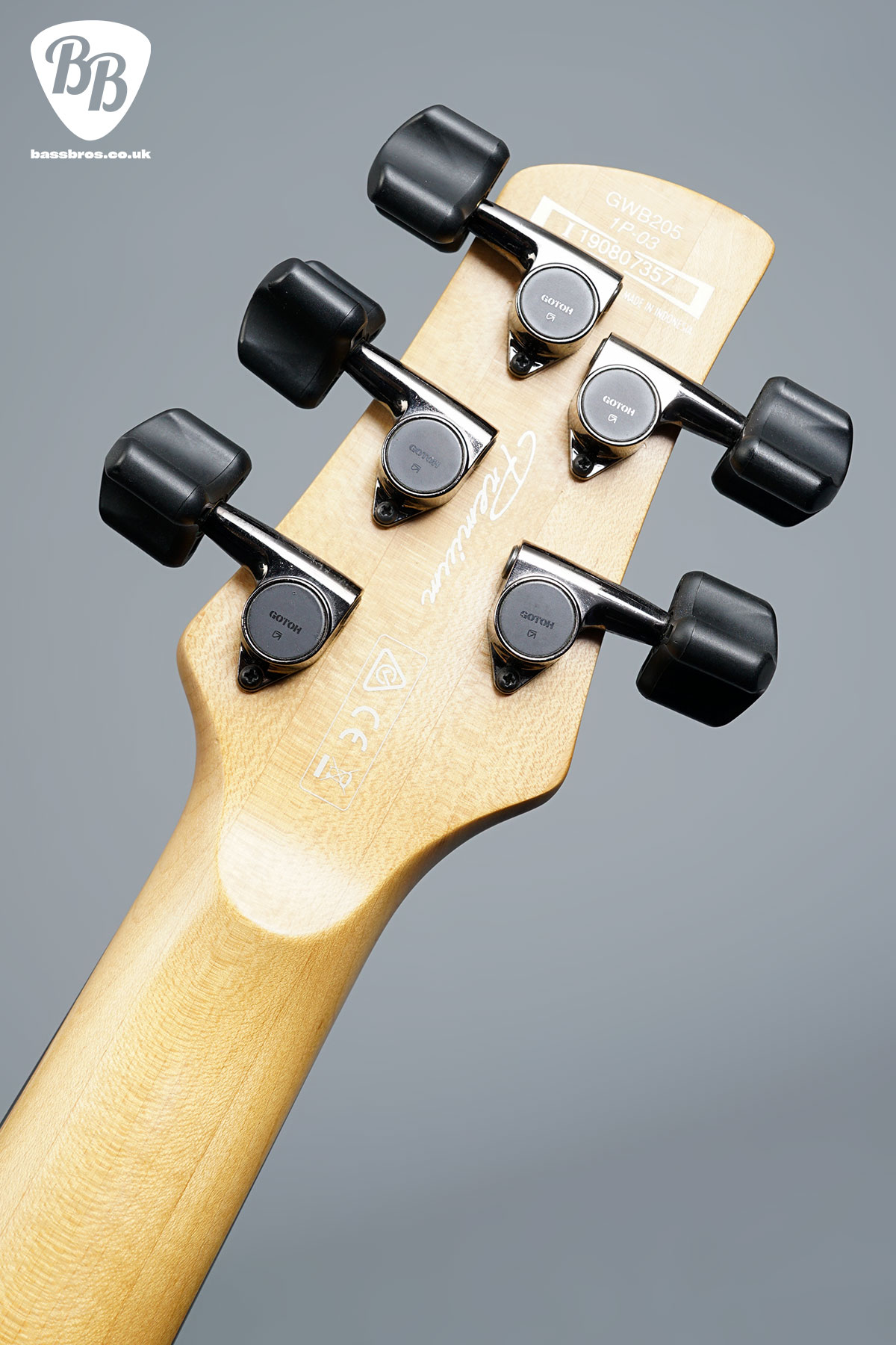 The GWB205 features an ash top on an SR series double-cutaway basswood body bolted to a maple neck with a fretless ebony fingerboard with offset white dot position markers. Components include a custom Bartolini passive soapbar bass pickup with a Bartolini preamp with a two-band EQ, a standard bridge with 16.5mm string spacing, a removable finger rest/ramp, a plastic nut and Gotoh tuners with custom Sure Grip buttons. This bass is in excellent condition with very few signs of wear. We have given the bass a full check over and everything works perfectly as it should, including the truss rod and electronics.