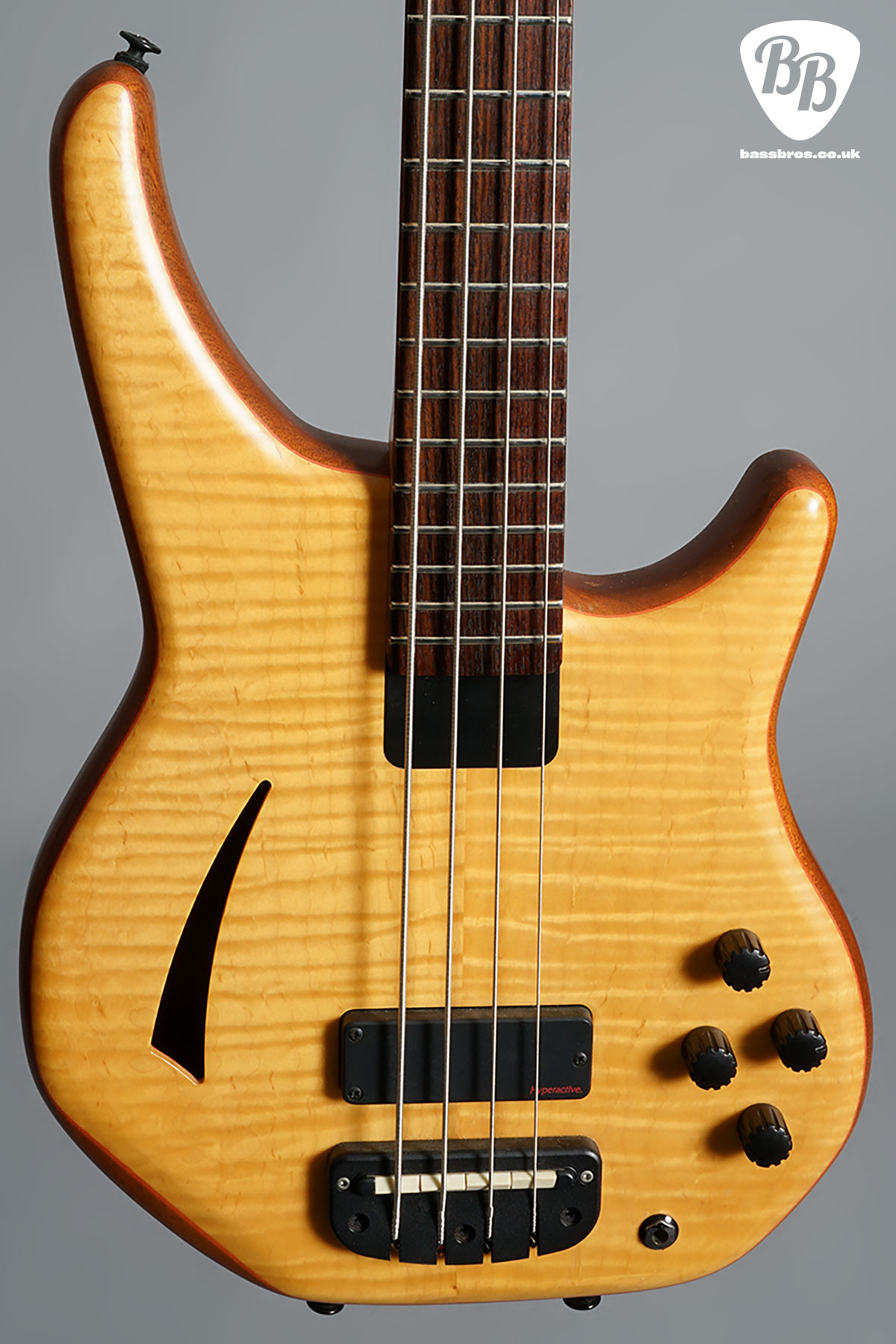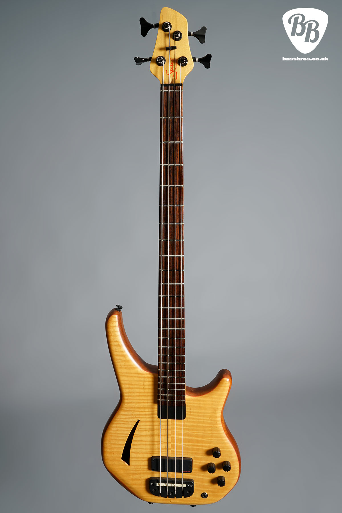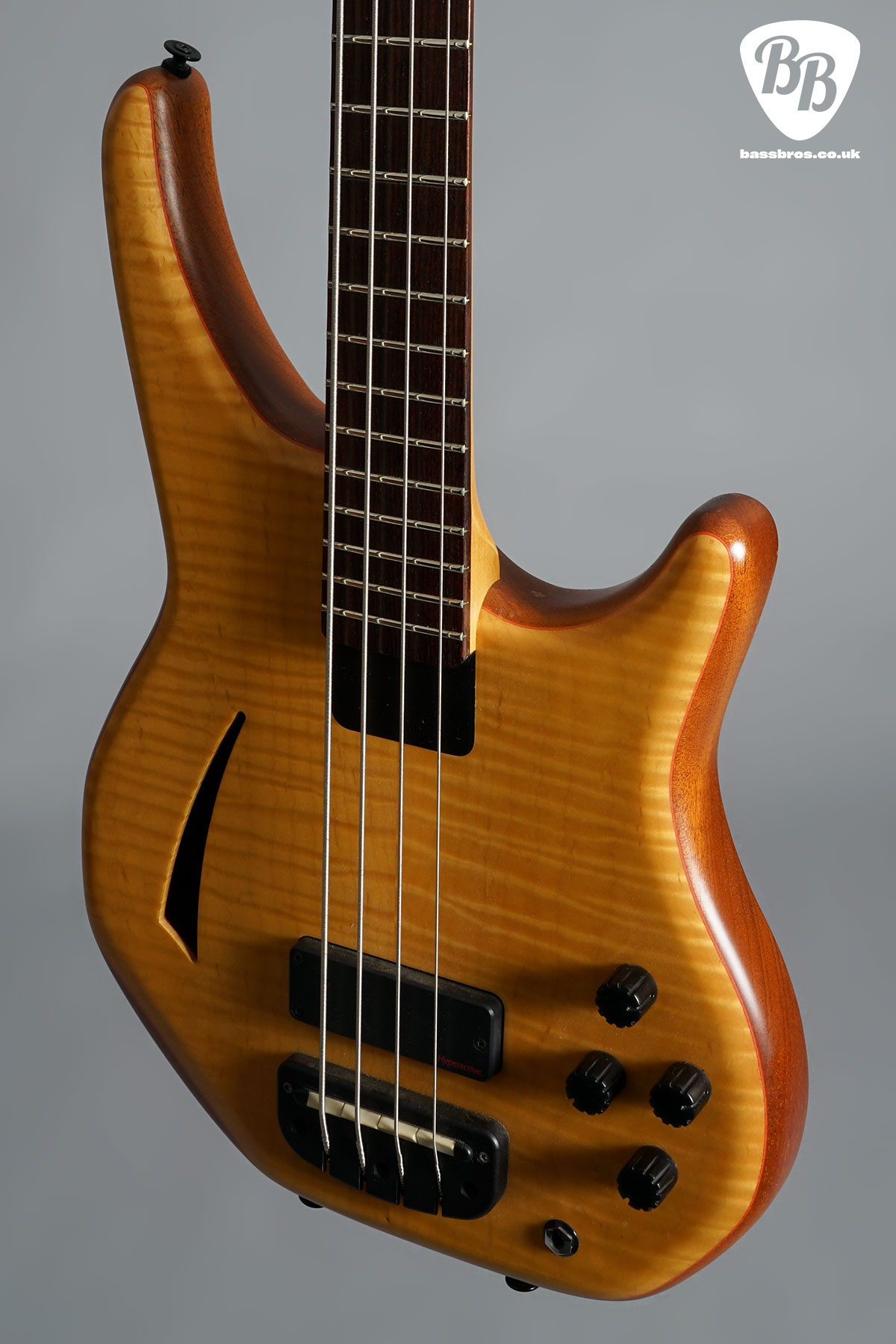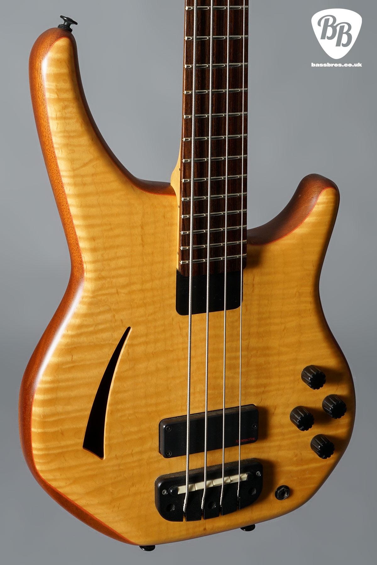 A different one from Status with this semi hollow Status Electro II. This one features a mahogany body, flamed maple top and piezo pickup along side the magnetic hyperactive pickup. These are nice and light basses, this one weighs in at just 7lbs11oz/3.5kgs There are a few small marks to the body but nothing major. Hardcase included